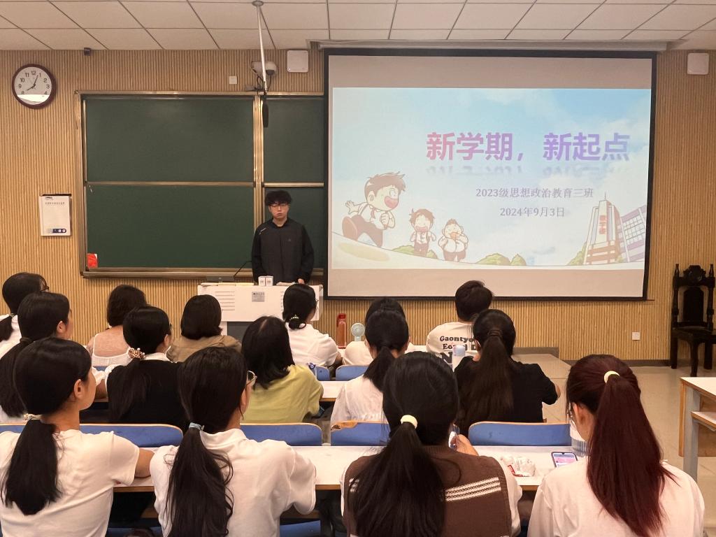 9月3日上午,太阳集团tyc59972023级思想政治教育三班在社科楼515召开“新学期,新起点”主题班会。我院2023级思想政治教育三班全体同学共同参与本次班会,班会由团支书郝瀚主持。