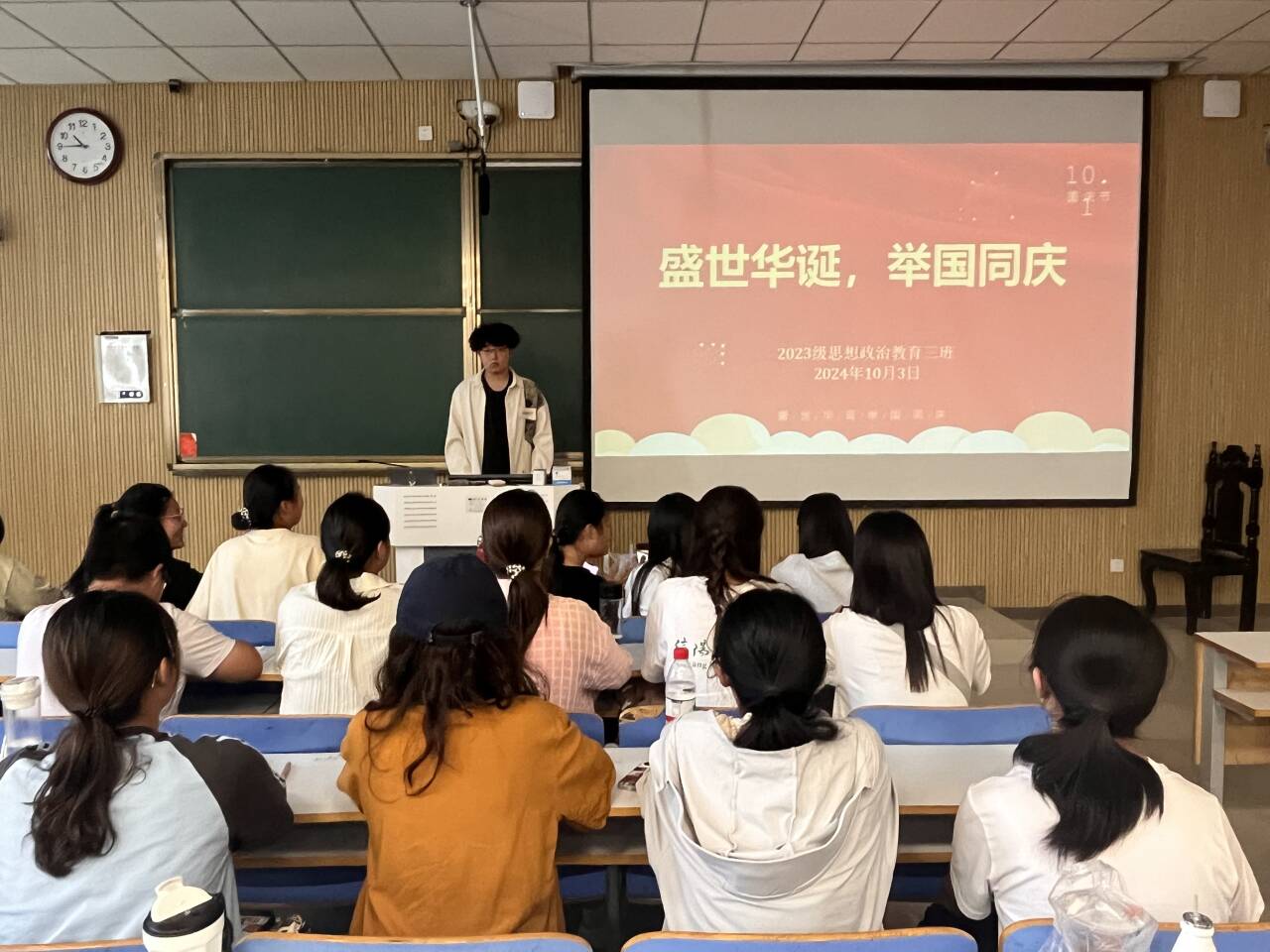 10月3日上午,太阳集团tyc59972023级思想政治教育三班在社科楼515召开“盛世华诞,举国同庆”主题班会。我院2023级思想政治教育三班全体同学共同参与本次班会,班会由团支书郝瀚主持。