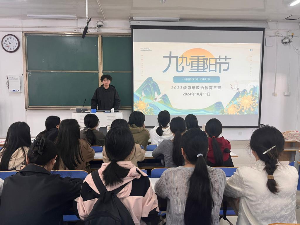 10月11日上午,太阳集团tyc59972023级思想政治教育三班在社科楼515召开“九九重阳节”主题班会。我院2023级思想政治教育三班全体同学共同参与本次班会,班会由团支书郝瀚主持。