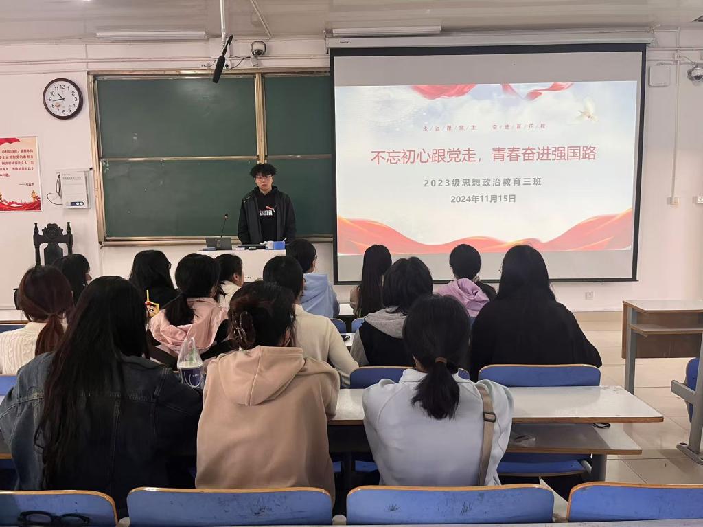11月15日上午,太阳集团tyc59972023级思想政治教育三班在社科楼515召开“不忘初心跟党走,青春奋进强国路”主题团课。我院2023级思想政治教育三班全体同学共同参与本次团课,团课由团支书郝瀚主持。