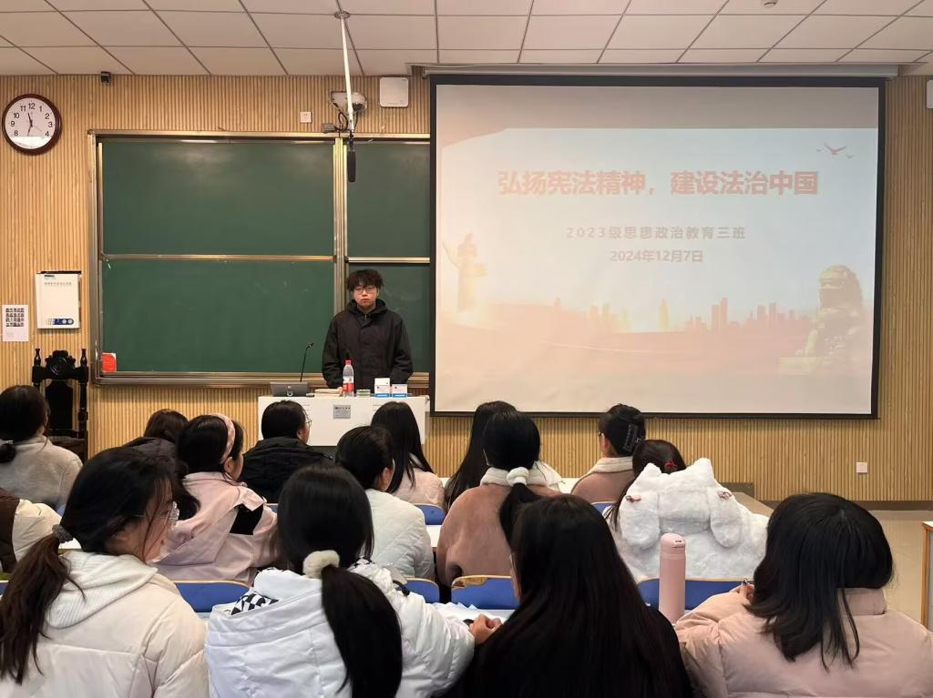 为弘扬宪法精神,推进全面依法治国,12月7日上午,太阳集团tyc59972023级思想政治教育三班在社科楼515召开“弘扬宪法精神,建设法治中国”主题团课。我院2023级思想政治教育三班全体同学共同参与本次团课,团课由团支书郝瀚主持。