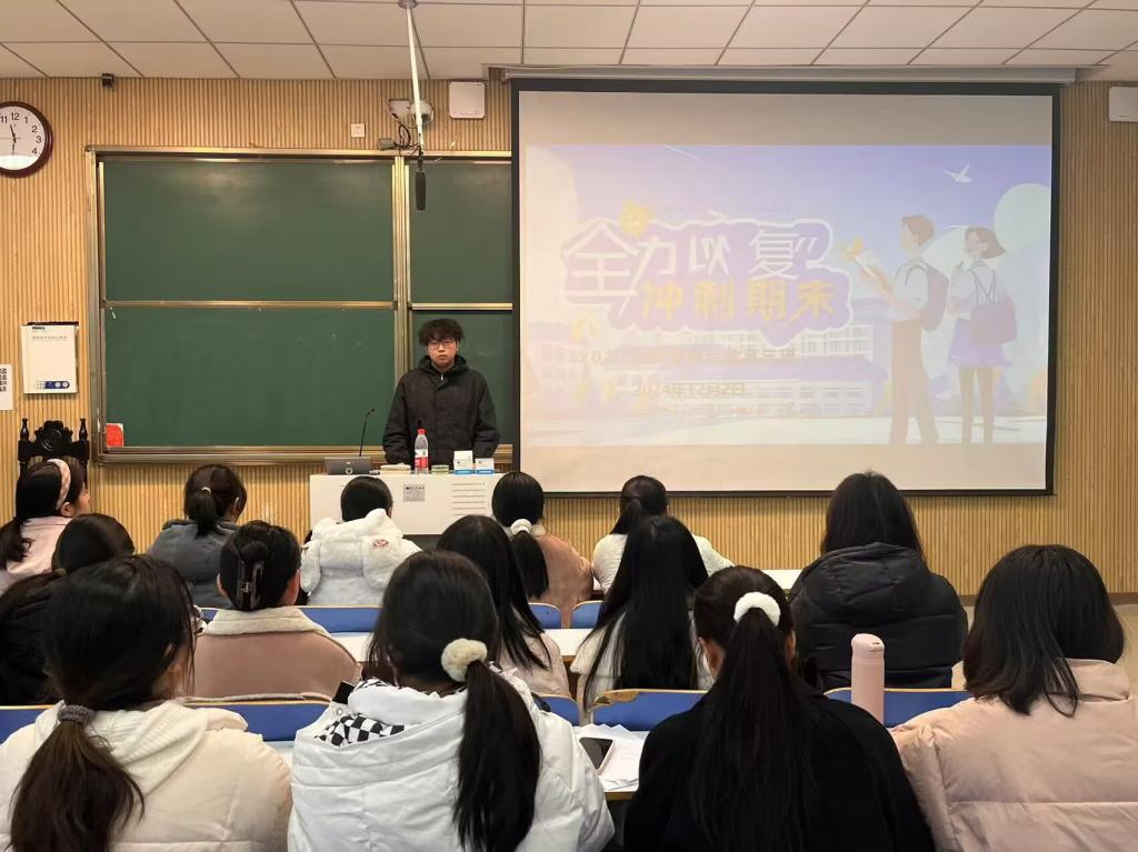 12月2日上午,太阳集团tyc59972023级思想政治教育三班在社科楼515召开“全力以‘复’,冲刺期末”主题班会。我院2023级思想政治教育三班全体同学共同参与本次班会,班会由团支书郝瀚主持。