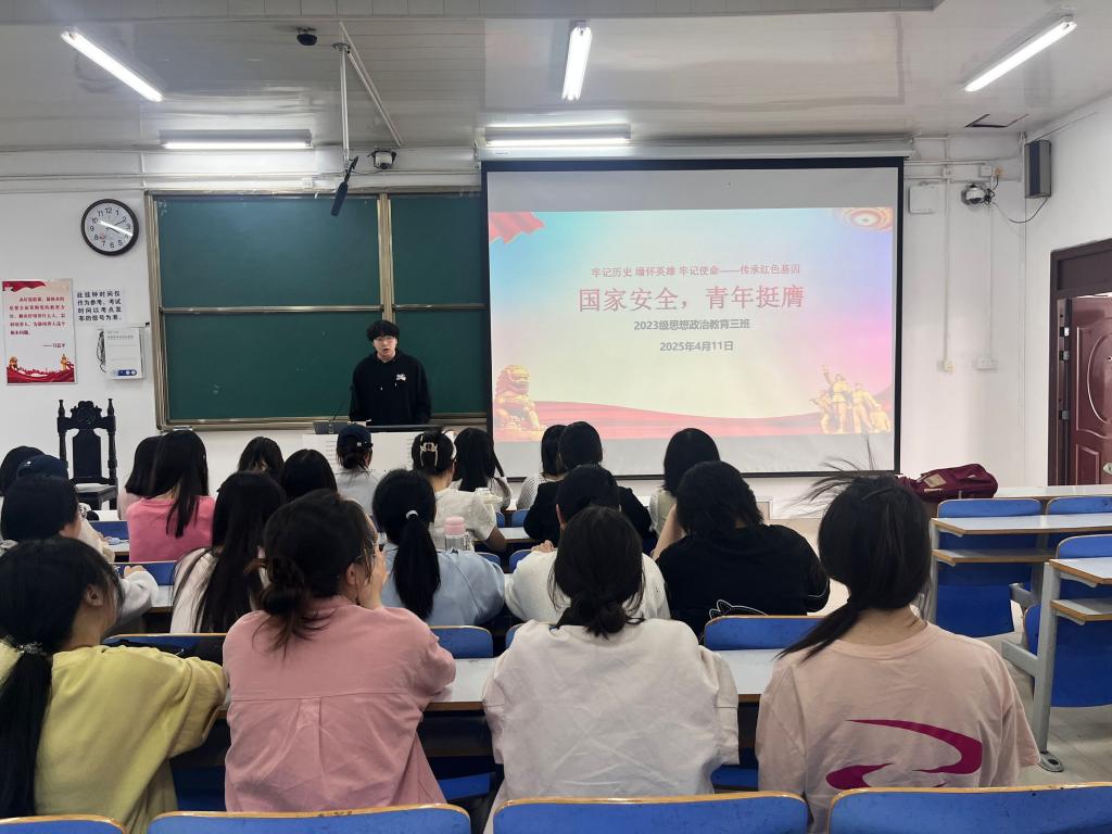 4月11日上午,太阳集团tyc59972023级思想政治教育三班在社科楼515召开“国家安全,青年挺膺”主题团课。我院2023级思想政治教育三班全体同学共同参与本次团课,团课由团支书郝瀚主持。