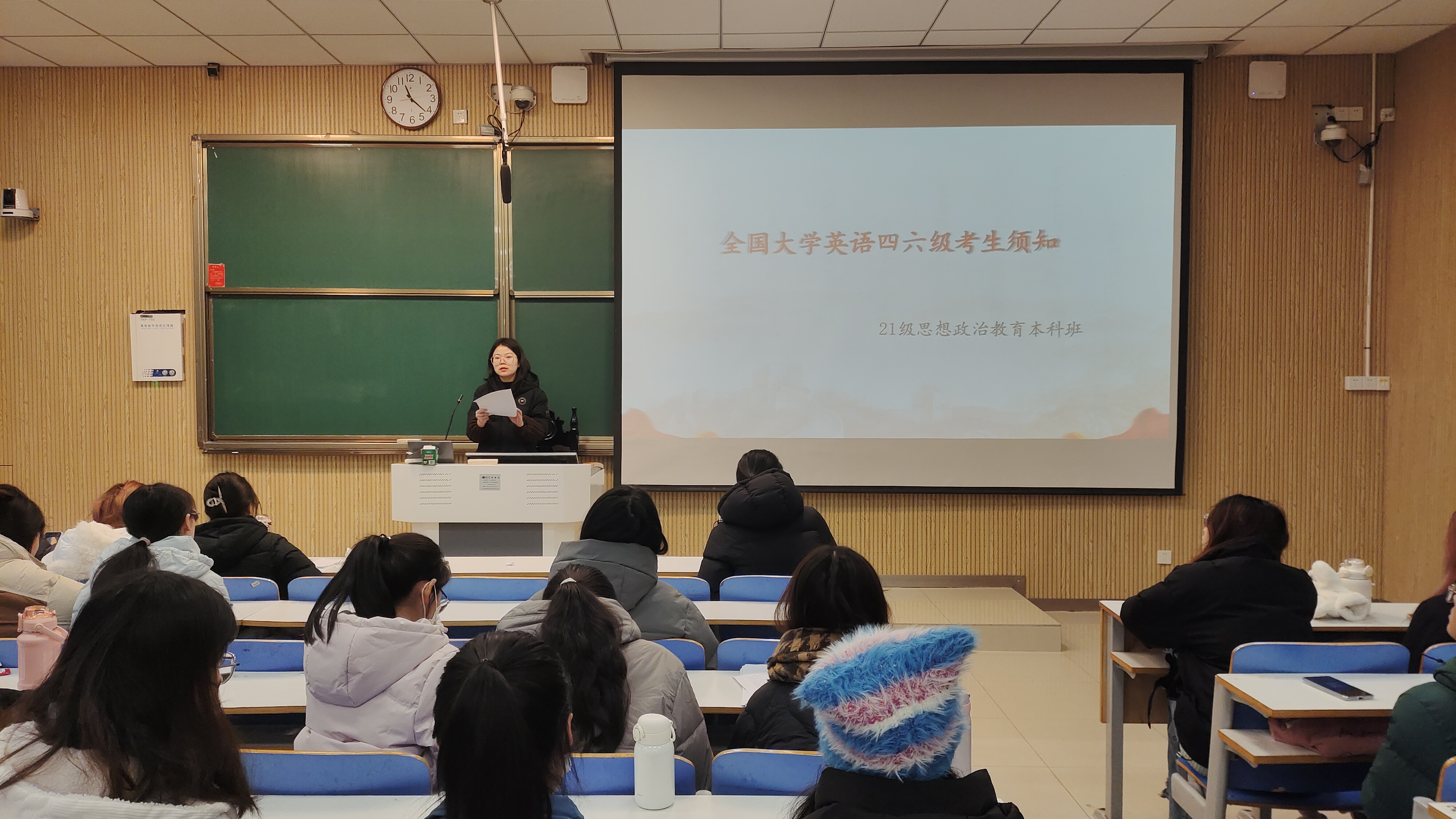 12月14日上午,太阳集团tyc59972021级思想政治教育全体成员在社科楼514教室召开“全国大学英语四六级考生须知”班会。辅导员高小佳及2021级思想政治教育一班、二班全体成员参加本次班会。班会由辅导员高小佳主持。