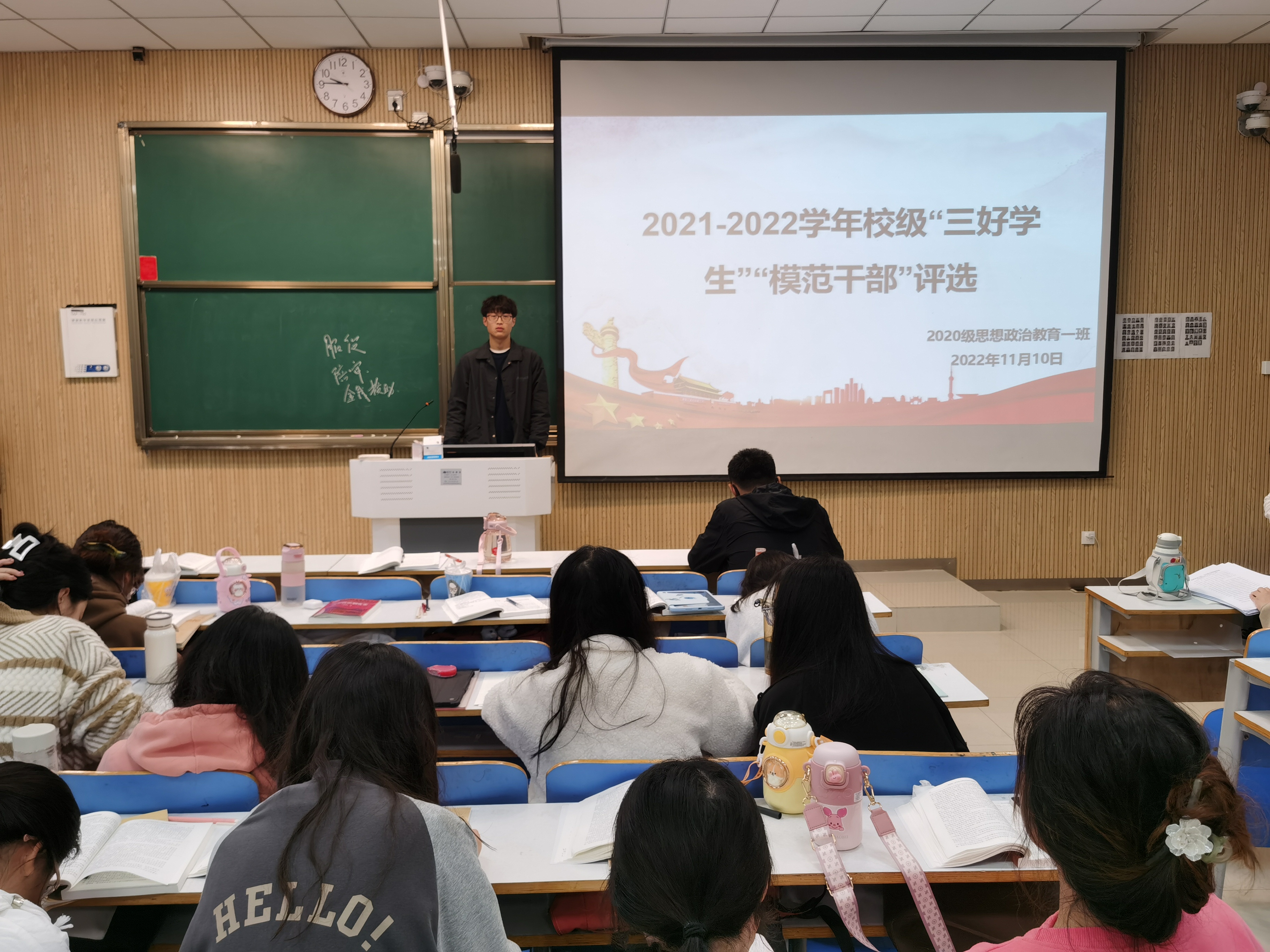 11月10日上午,太阳集团tyc59972020级思想政治教育一班在社科楼515教室开展2021—2022学年校级“三好学生”“模范干部”评选会,2020级思想政治教育一班全体成员参加此次会议。会议由副班长白帅豪主持。
