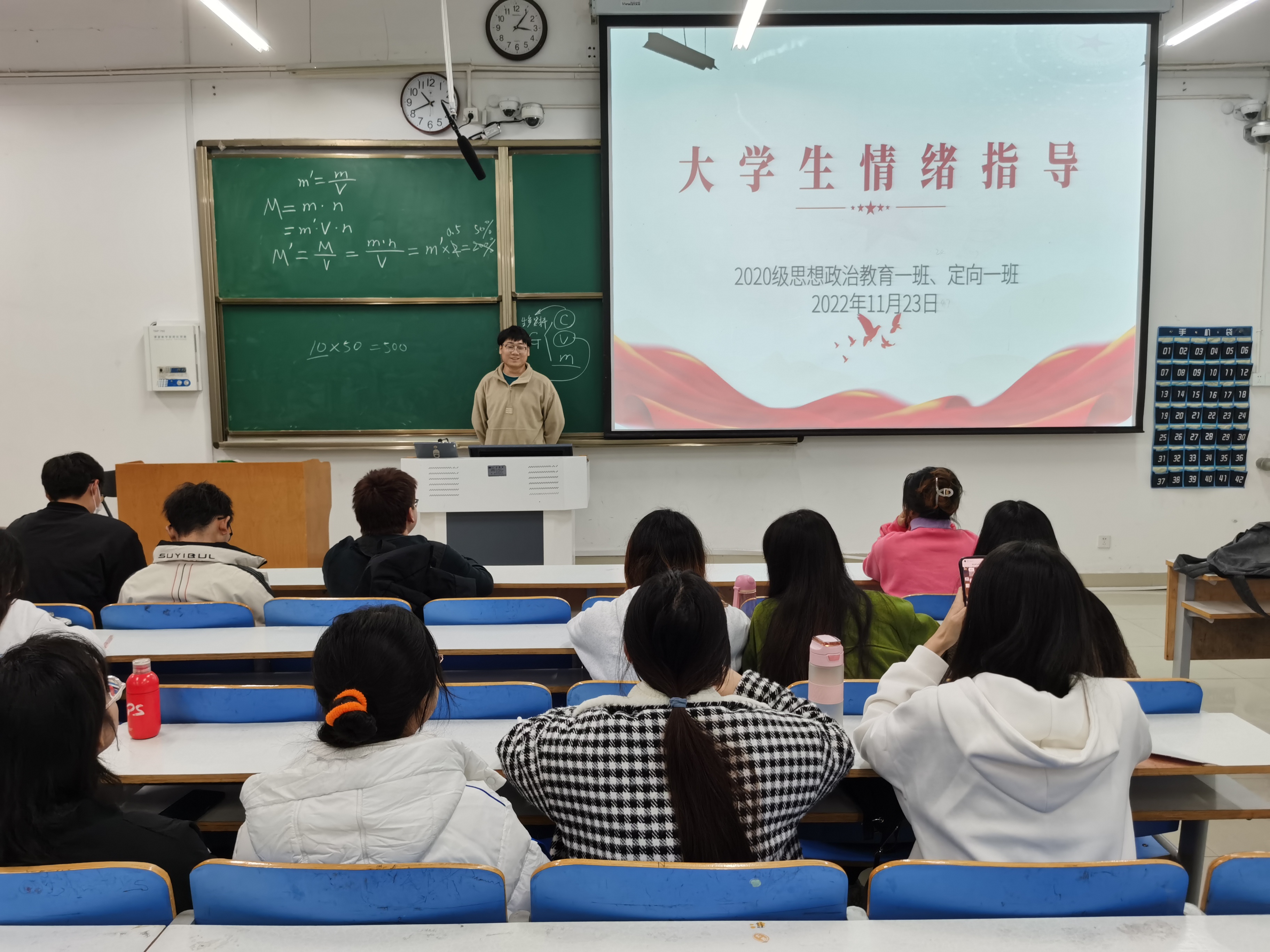 11月23日下午,太阳集团tyc59972020级思想政治教育一班、定向一班在社科楼415教室顺利举办“大学生情绪指导”心理班会。太阳集团tyc59972020级思想政治教育一班、定向一班全体学生聆听了此次班会,班会由心理委员王旭主持。