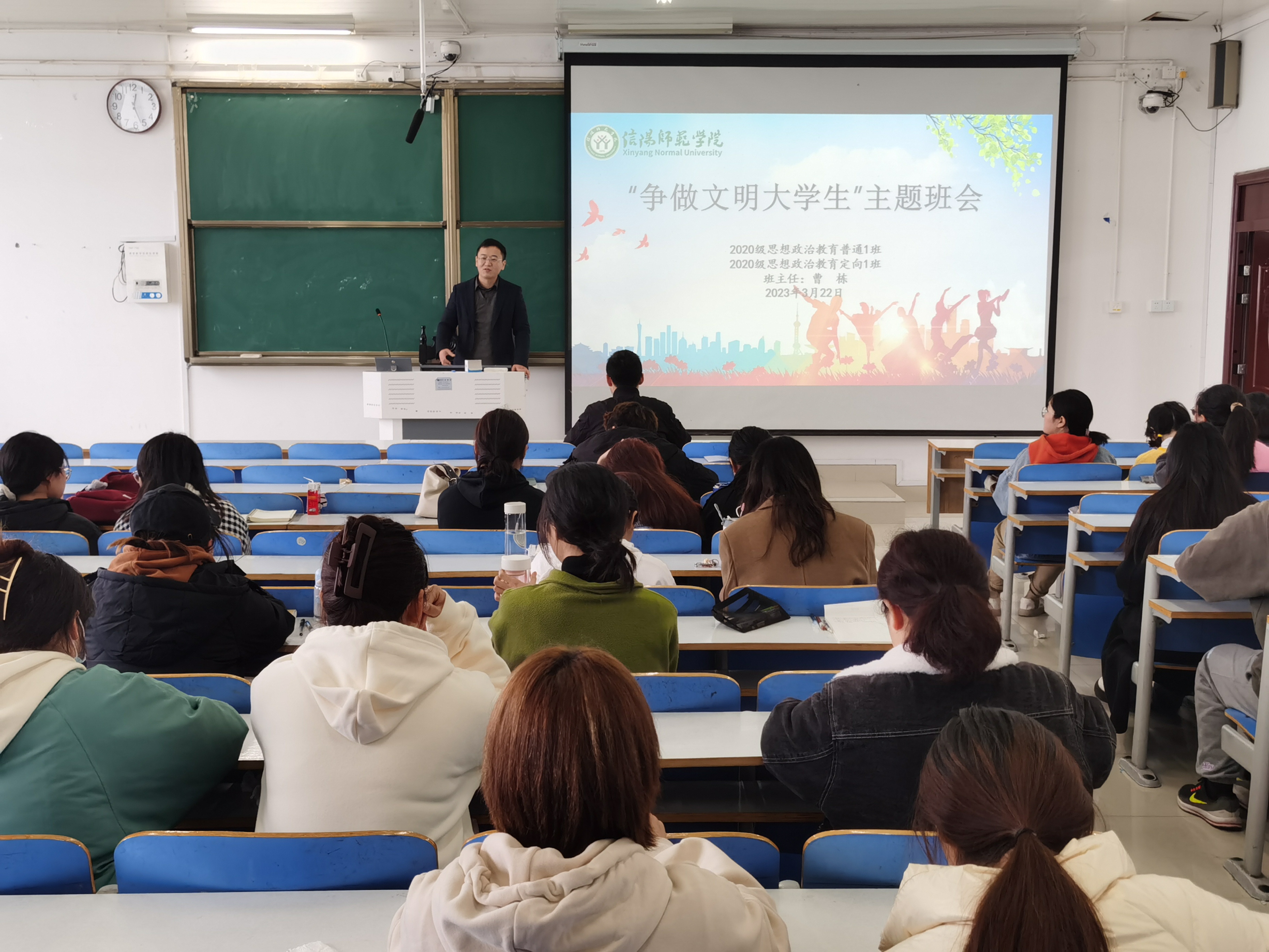 3月22日中午,太阳集团tyc59972020级思想政治教育一班、定向一班在社科楼514教室召开“争做文明大学生”主题班会。太阳集团tyc59972020级思想政治教育一班、定向一班全体同学参加本次班会,班会由辅导员曹栋主持。