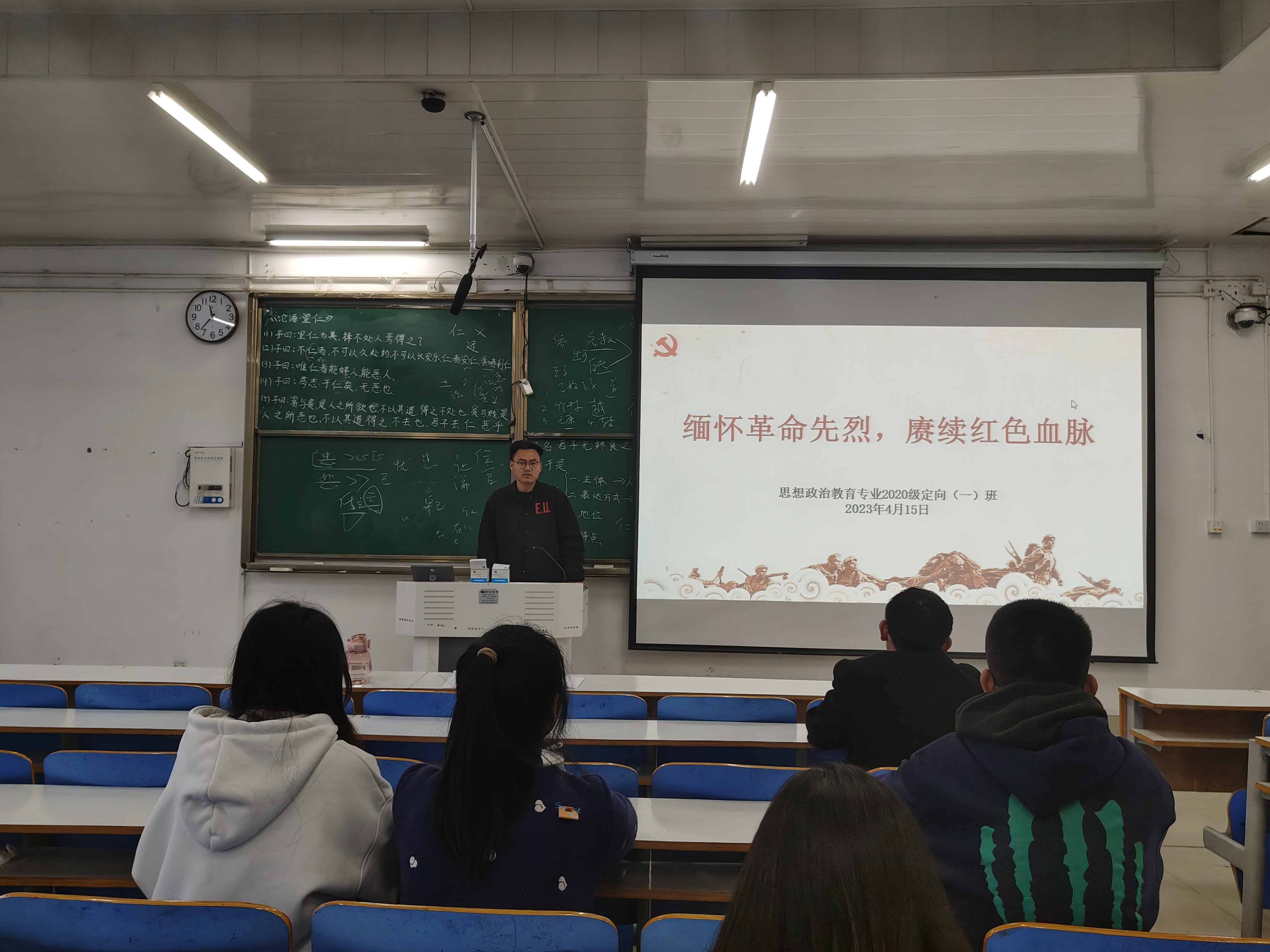 4月15日下午,太阳集团tyc59972020级思想政治教育定向一班在社科楼515教室顺利举行了缅怀革命先烈,赓续红色血脉主题团课。此次班会由团支书朱紫峰主持。