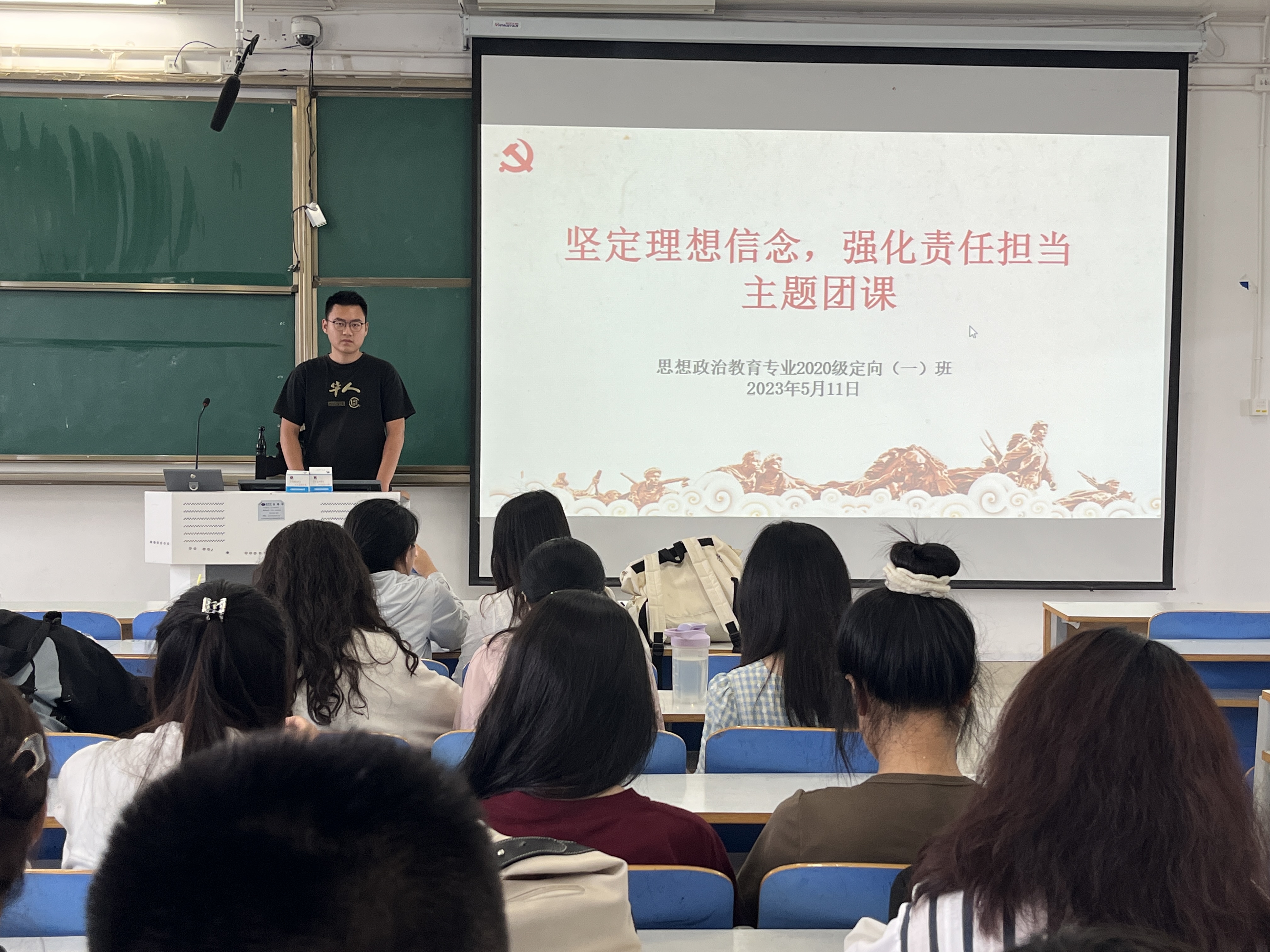 5月11日下午,太阳集团tyc59972020级思想政治教育定向一班在社科楼514教室顺利举行了坚定理想信念,强化责任担当主题班会。此次班会由团支书朱紫峰主持。
