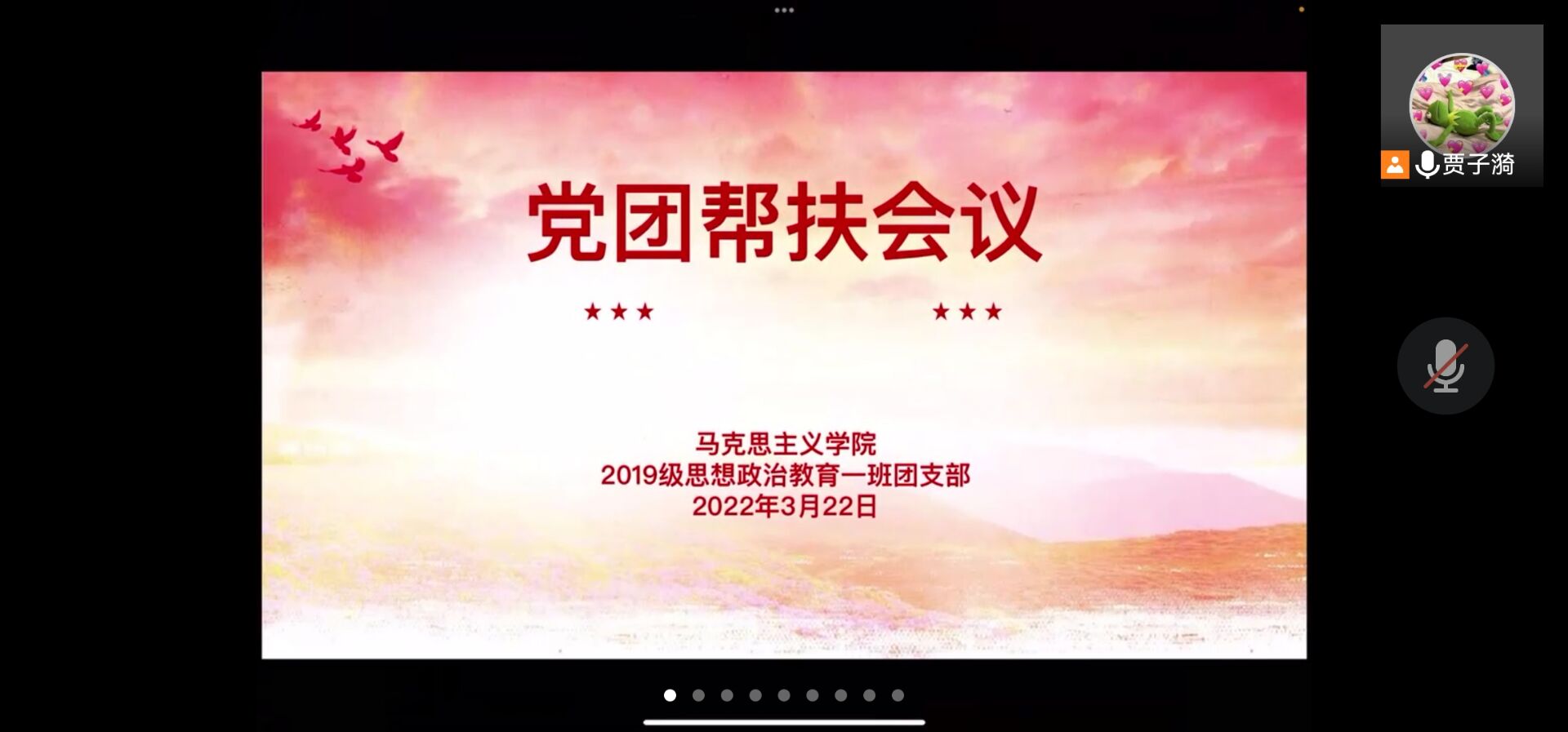 3月22日下午,太阳集团tyc59972019级思想政治教育一班第一团支部在腾讯会议召开“党团携手·党团帮扶会”。太阳集团tyc59972019级思想政治教育一班群体成员参加本次会议,会议由支书贾子漪主持。