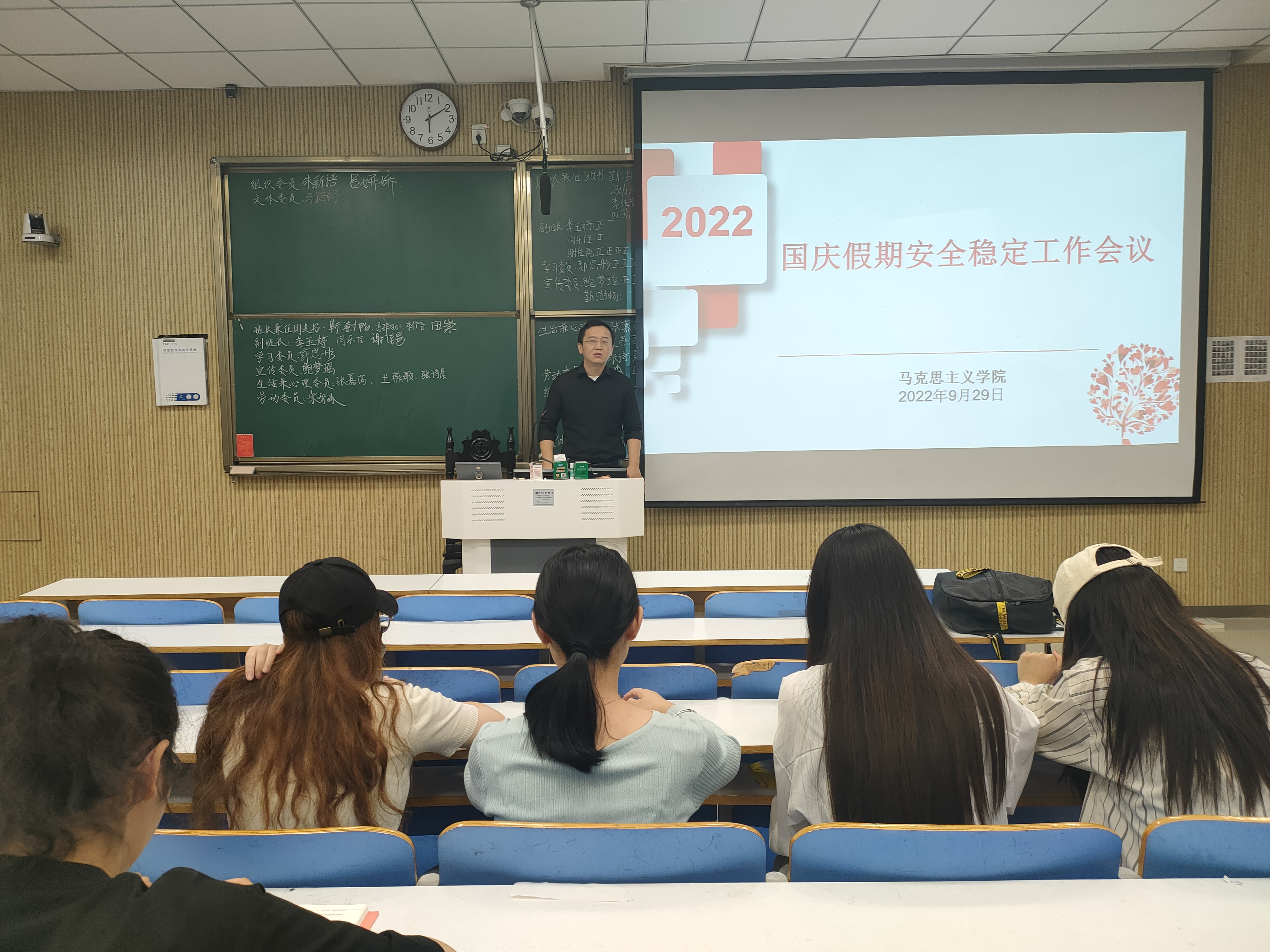9月29日,太阳集团tyc59972020级思想政治教育定向一班、普通一班在社科楼515教室顺利举办国庆假期安全稳定工作会议。定向一班、普通一班全体同学参与了此次会议。