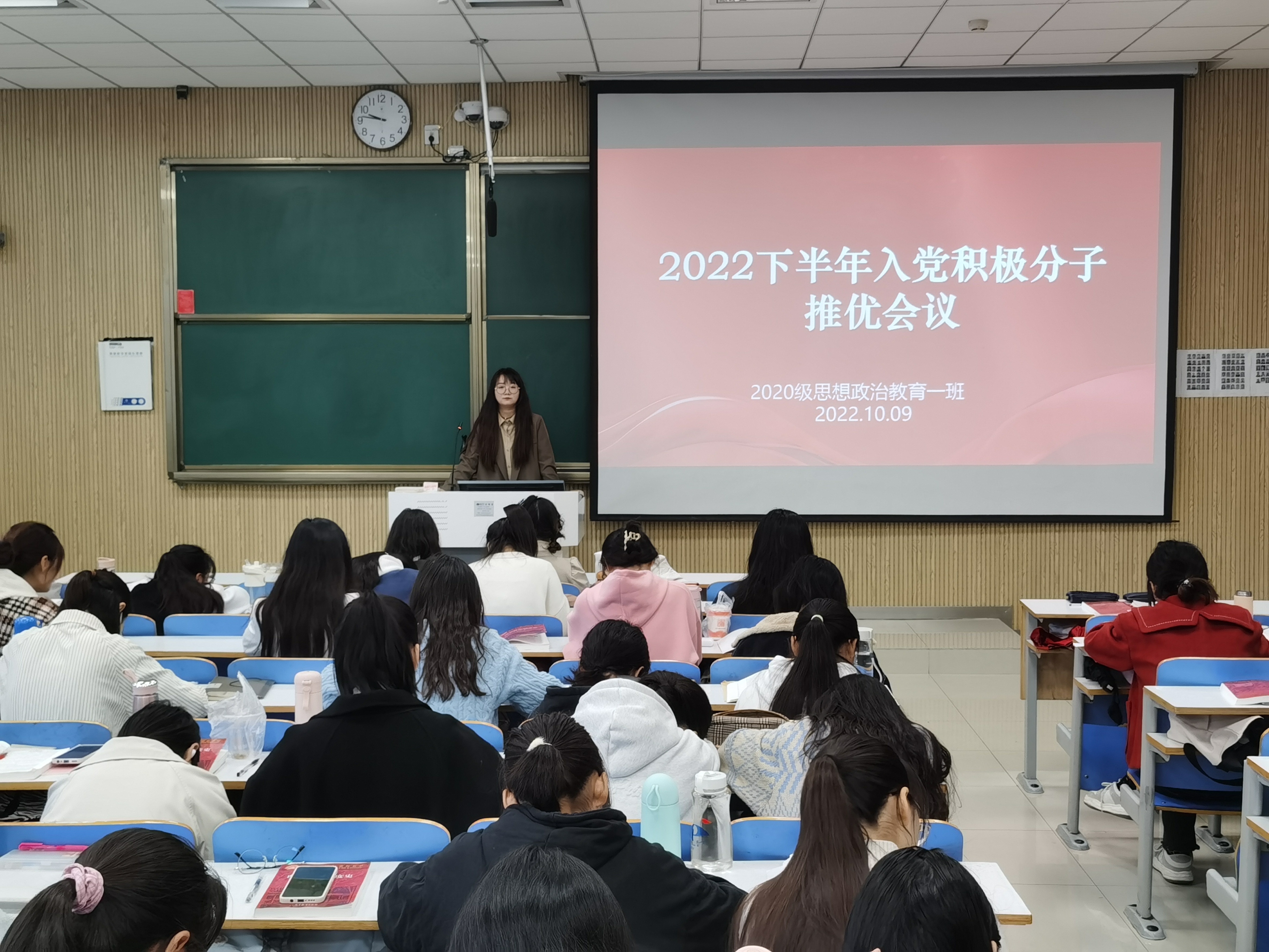 10月9日上午,太阳集团tyc59972020级思想政治教育一班团支部在社科楼515教室召开2022年下半年入党积极分子推优会议。我支部全体团员参加此次推优会议,会议由团支部书记卢茜雨主持。