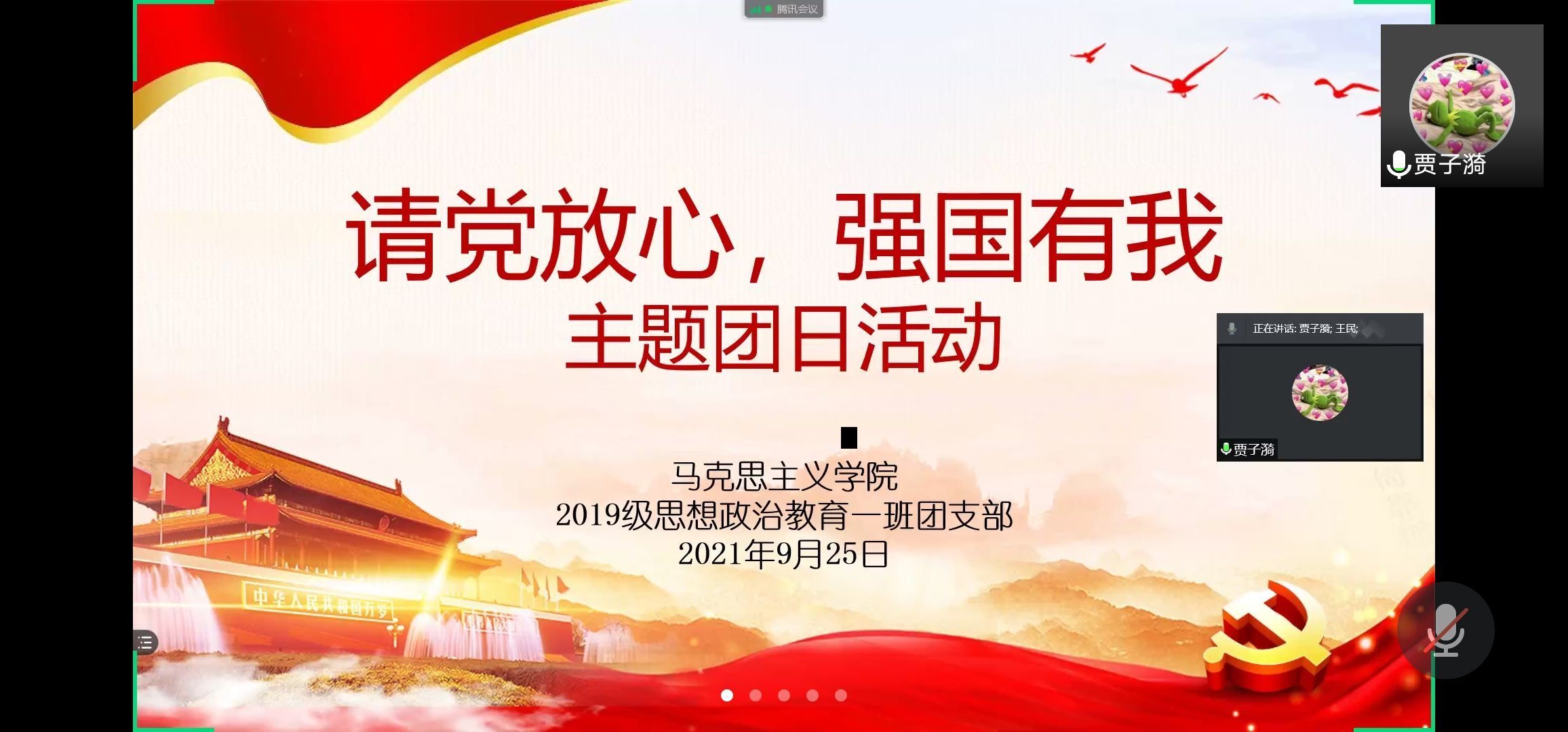 9月25日下午,太阳集团tyc59972019级思想政治教育一班第一团支部在腾讯视频举办“请党放心,强国有我”主题团日活动。太阳集团tyc59972019级思想政治教育一班全体团员参加本次活动。活动由团支书贾子漪主持。