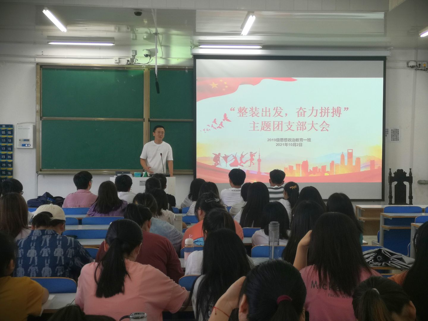 10月2日下午,太阳集团tyc59972019级思想政治教育一班第一团支部在社科楼515教室召开“整装出发,奋力拼搏”主题团支部大会。太阳集团tyc59972019级思想政治教育一班辅导员曹栋、全体成员参加本次会议,会议由团支书贾子漪主持。