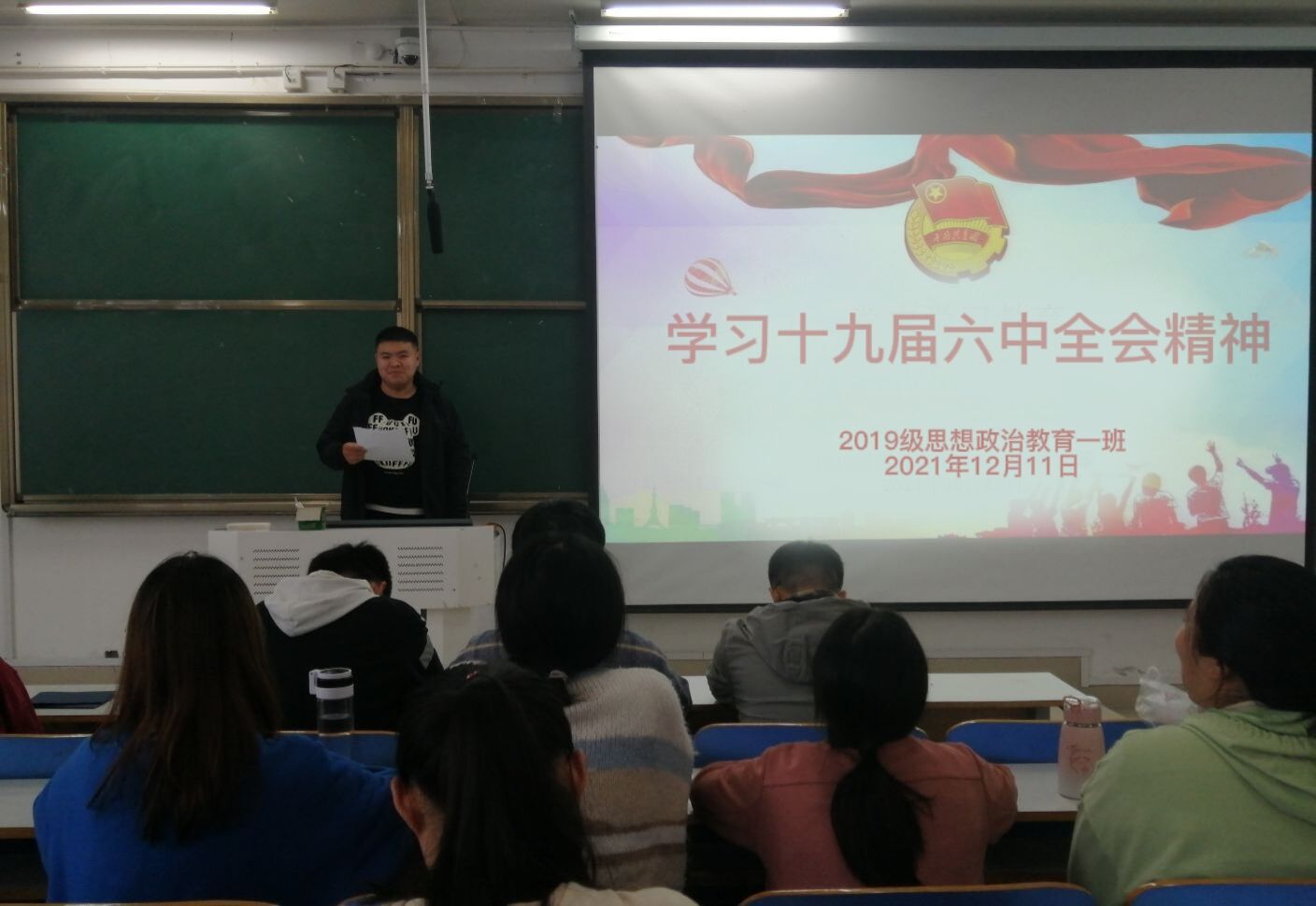 12月11日上午,太阳集团tyc59972019级思想政治教育一班第一团支部在社科楼516教室召开“学习党的十九届六中全会精神”主题团课。太阳集团tyc59972019级思想政治教育一班团支部全体团员参加本次团课。团课由团支书贾子漪主持。