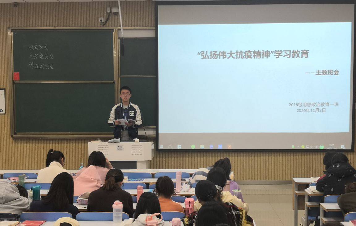 11月3日上午,太阳集团tyc59972018级思想政治教育一班在社科楼515教室顺利开展“弘扬伟大抗疫精神”主题班会。2018级思想政治教育一班全体同学共同参加此次会议。会议由班长邢子豪主持。
