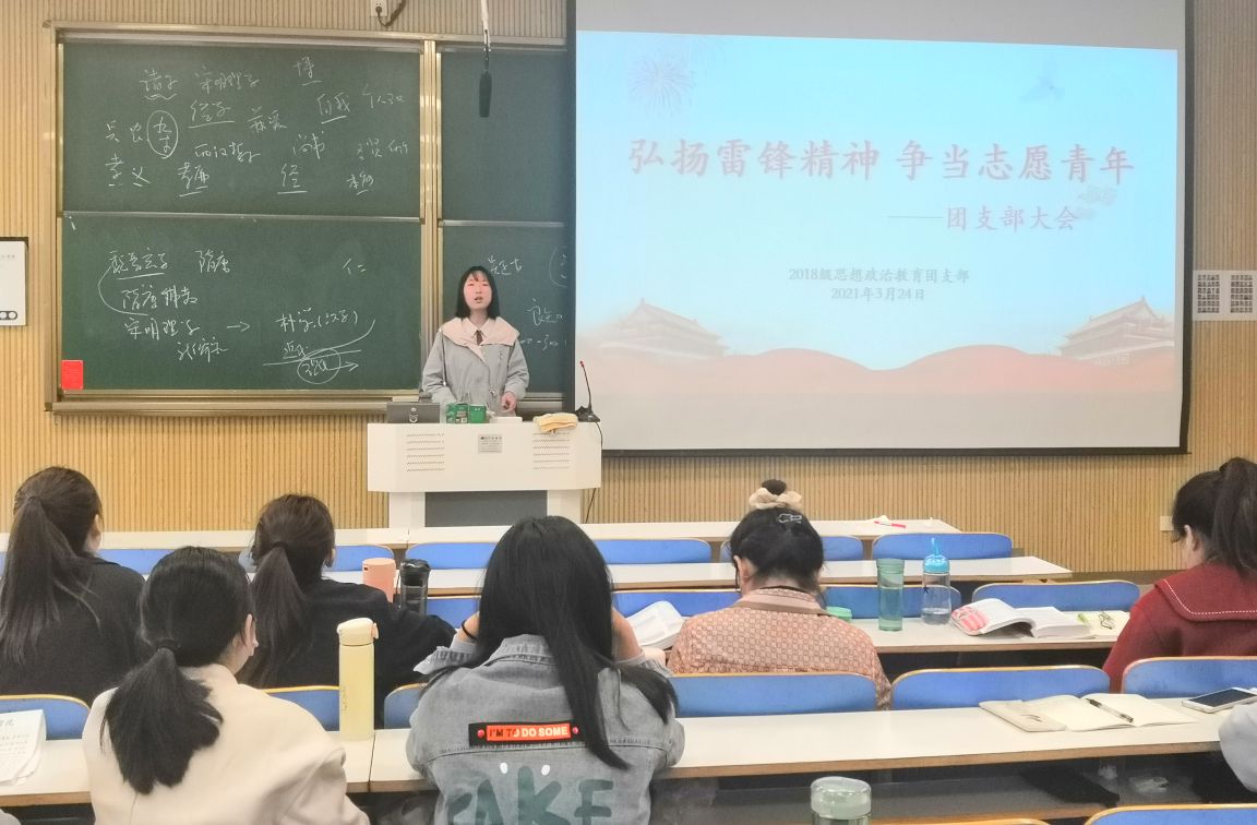 3月26日上午, 太阳集团tyc59972018级思想政治教育团支部在社科楼516教室顺利开展“弘扬雷锋精神,争当志愿青年”主题会议。2018级全体学生共同参加此次会议。会议由第一团支部书记靳雨露主持。