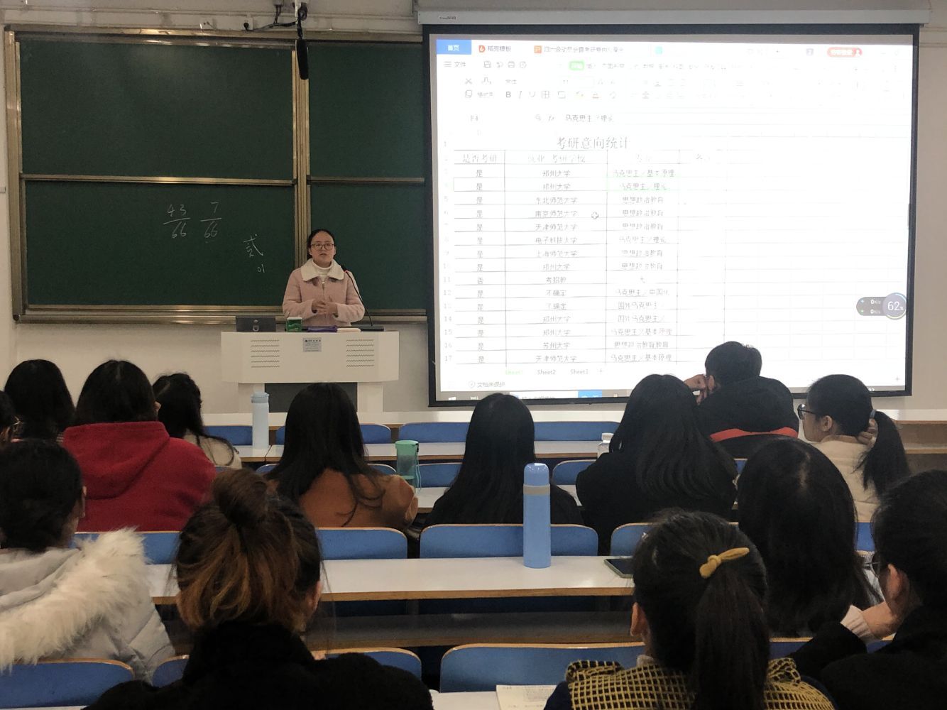 会上,邹创分析了本班同学四六级过关率,指出同学们仍需努力,要从思想上重视起来,认真对待考试。他请班级中四位通过四六级考试的同学分享经验。肖妍杰、王盼盼、孙亚茜、刘智玉四位同学依次介绍备考心得,她们从做题顺序、做题步骤、做题技巧、备考心态四方面出发,将各个题型逐一分析,为同学们答疑解惑、提供做题技巧,并强调要及时调整心态,轻松应对考试。随后辅导员曹菁菁总结发言,她指出英语对大家的发展至关重要,同学们要摆正心态,积极备考。此外她分享了当前考研形势,并表示作为大三学生,应当尽早明确考研意向、增强考研信心,主动出击积极了解考研信息,同时致力于本科毕业即就业的同学也要多加留意就业信息,明确就业规划,为日后发展奠定基础。