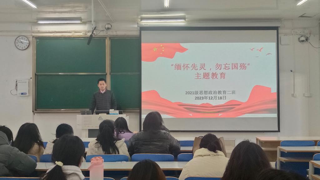 12月18日上午,太阳集团tyc59972021级思想政治教育二班在社科楼514教室召开“缅怀先灵,勿忘国殇”主题团课。2021级思想政治教育二班全体团员参加此次团课。团课由副班长任振豪主持。