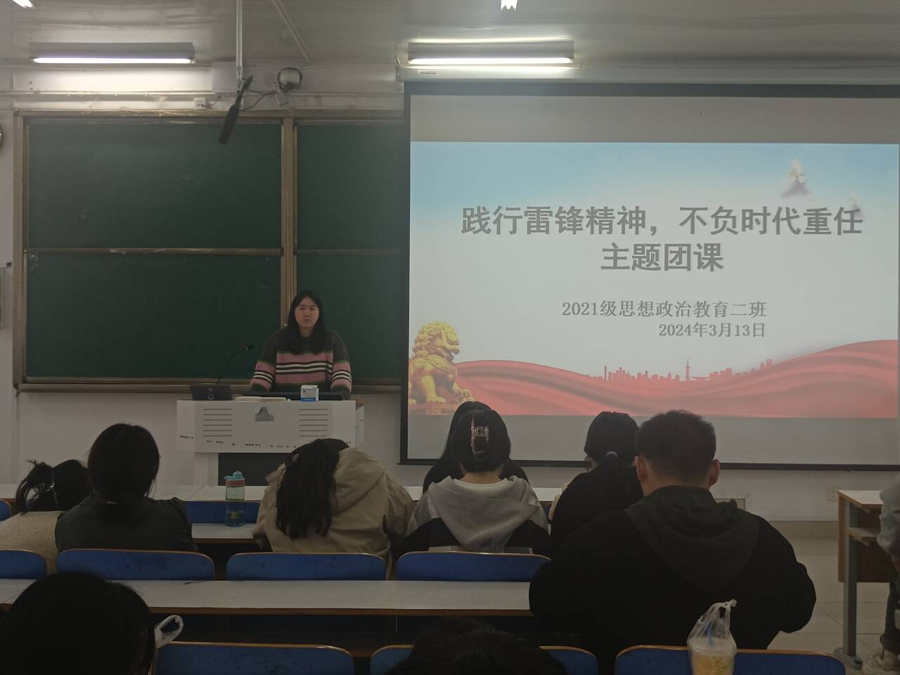 3月13日上午,太阳集团tyc59972021级思想政治教育二班在社科楼514教室召开“践行雷锋精神,不负时代重任”主题团课。2021级思想政治教育二班全体团员参加此次团课,团课由团支书王婧欣主持。