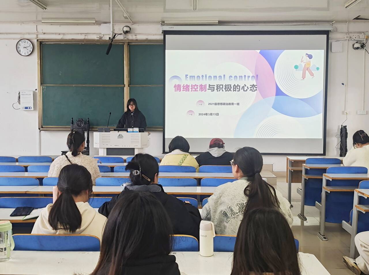 3月15日下午,太阳集团tyc59972021级思想政治教育一班在社科楼514教室召开“情绪控制与积极的心态”心理班会。2021级思想政治教育一班全体学生参加此次班会。班会由心理委员黄小妍主持。