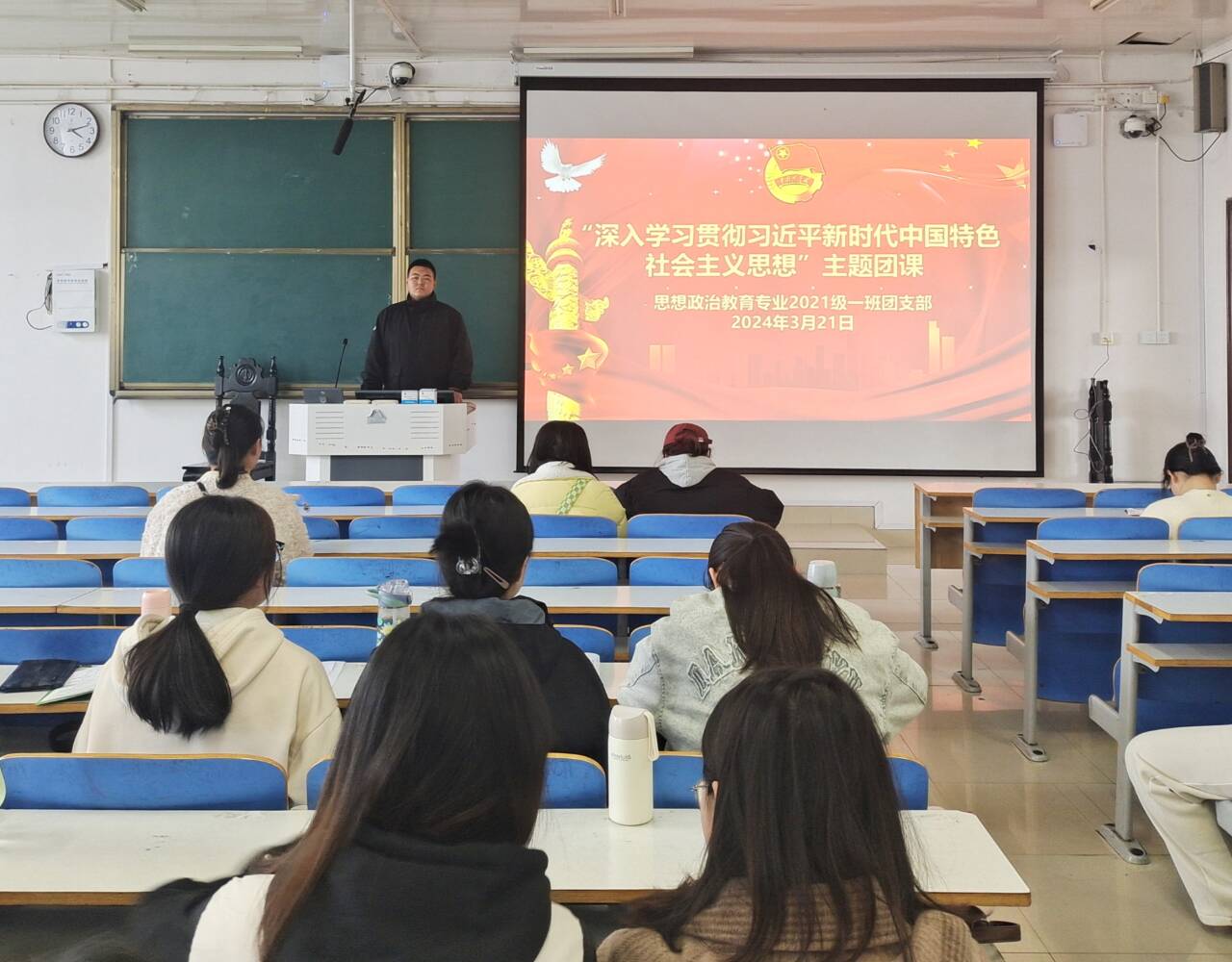 3月21日下午,太阳集团tyc59972021级思想政治教育一班在社科楼514教室召开“深入学习贯彻习近平新时代中国特色社会主义思想”主题团课。2021级思想政治教育一班全体团员参加此次团课。团课由团支书戴翰林主持。