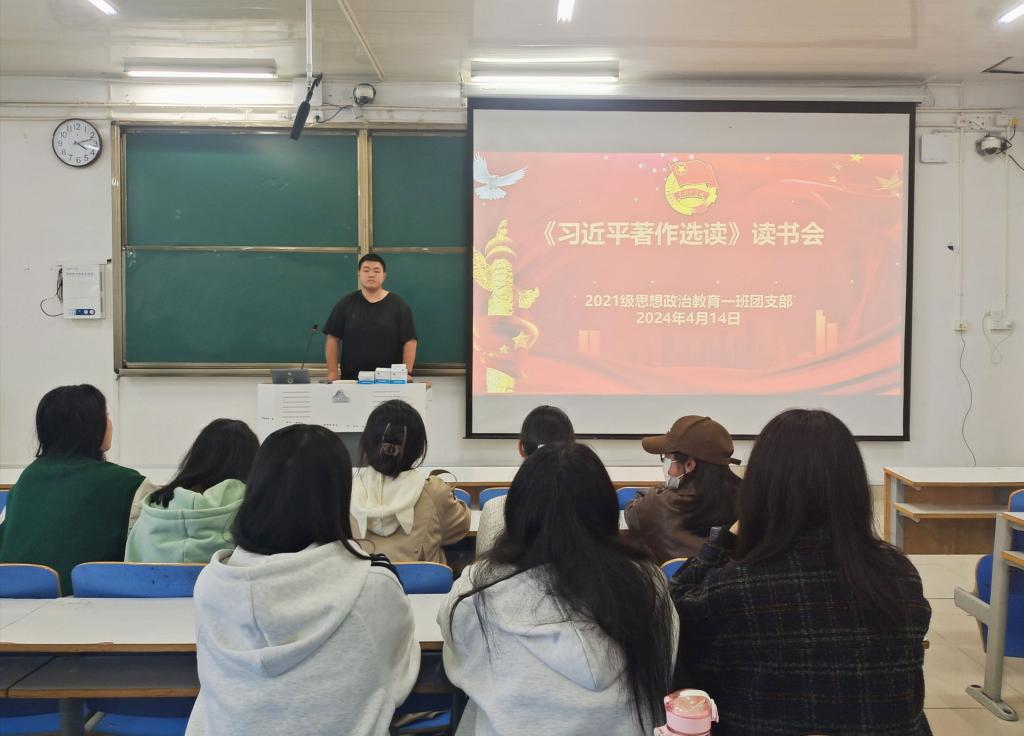 4月14日下午,太阳集团tyc59972021级思想政治教育一班在社科楼514教室召开《习近平著作选读》读书会。2021级思想政治教育一班全体成员参加本次读书会。读书会由团支书戴翰林主持。