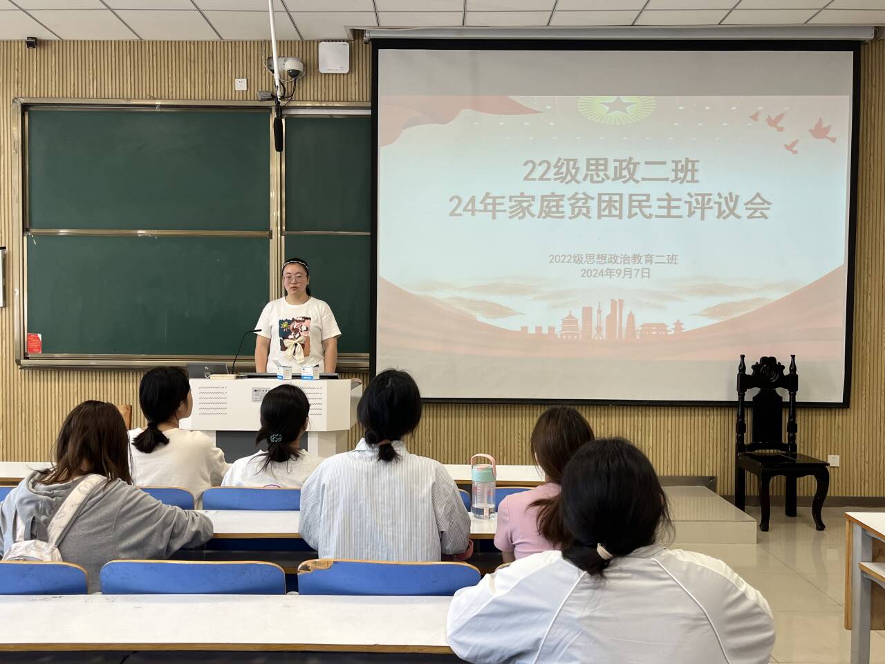 9月7日下午,太阳集团tyc59972022级思想政治教育二班在社科楼514教室召开2024年家庭贫困民主评议会。我院2022级思想政治教育二班民主评议小组共同参与此次评议会。会议由班长李佳音主持。