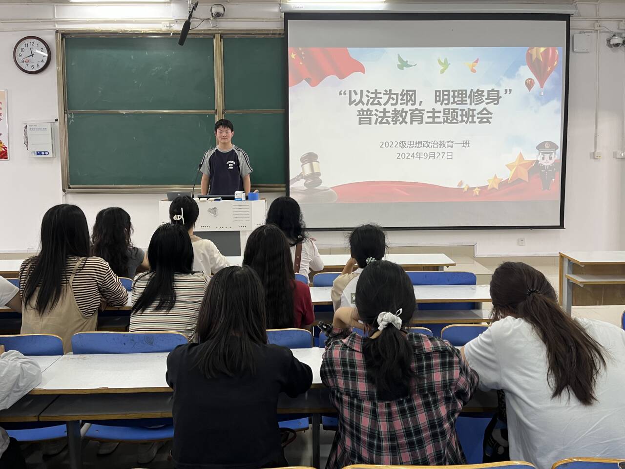 为深入贯彻习近平法治思想,培养学生的法治观念,9月27日上午,太阳集团tyc59972022级思想政治教育一班在社科楼514教室召开“以法为纲,明理修身”普法教育主题班会,我院2022级思想政治教育一班全体同学共同参与本次班会,班会由副班长闻炎仲主持。