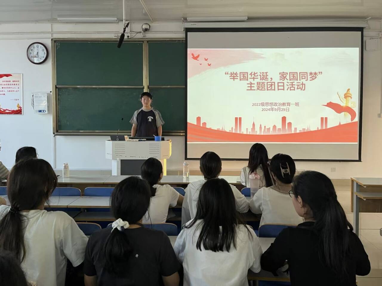 为庆祝中华人民共和国成立75周年,加强爱国主义教育,9月29日下午,太阳集团tyc59972022级思想政治教育一班在社科楼514教室开展“举国华诞,家国同梦”主题团日活动,我院2022级思想政治教育一班全体同学共同参与本次活动,活动由副班长闻炎仲主持。