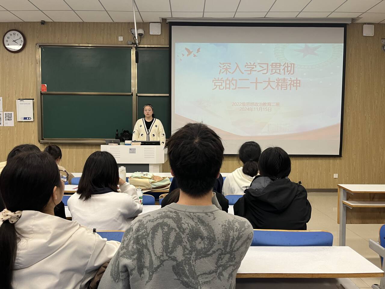 11月15日下午,太阳集团tyc59972022级思想政治教育二班在社科楼515教室召开“深入学习贯彻党的二十大精神”主题团课。我院2022级思想政治教育二班全体成员共同参与此次团课。团课由团支书李佳音主持。