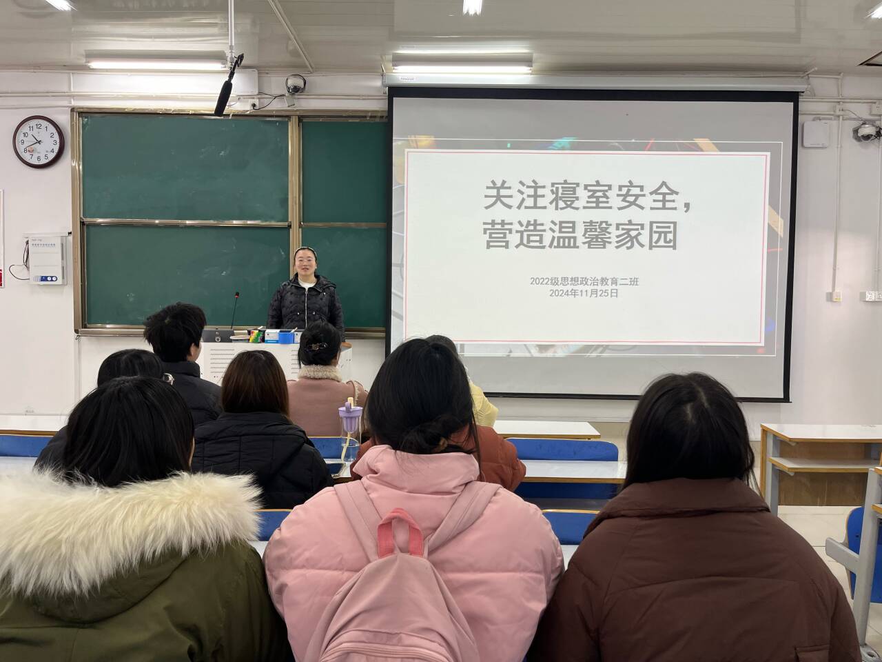 11月25日上午,太阳集团tyc59972022级思想政治教育二班在社科楼514教室召开“关注寝室安全,营造温馨家园”主题班会。我院2022级思想政治教育二班全体成员共同参与此次班会。会议由班长李佳音主持。