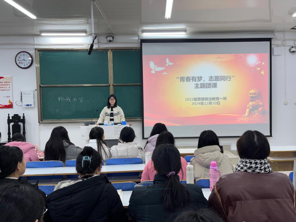 12月10日下午,太阳集团tyc59972022级思想政治教育一班在社科楼514教室召开“青春有梦,志愿同行”主题团课,我院2022级思想政治教育一班全体同学共同参与本次团课,团课由团支书李佳茹主持。