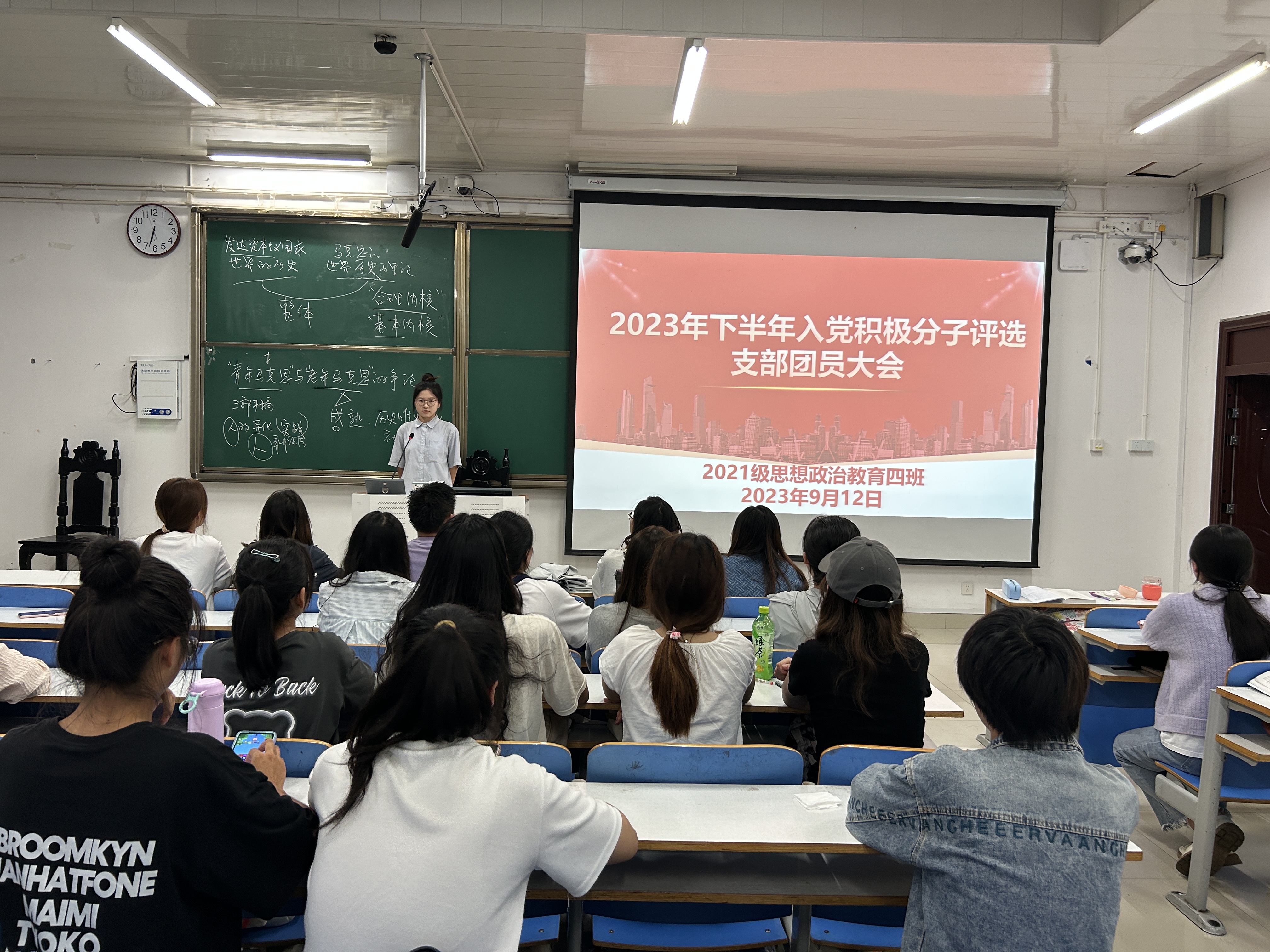 9月12日下午,太阳集团tyc59972021级思想政治教育四班在社科楼515教室召开入党积极分子评选支部大会。2021级思想政治教育四班全体团员共同参会。会议由团支书刘珂含主持。