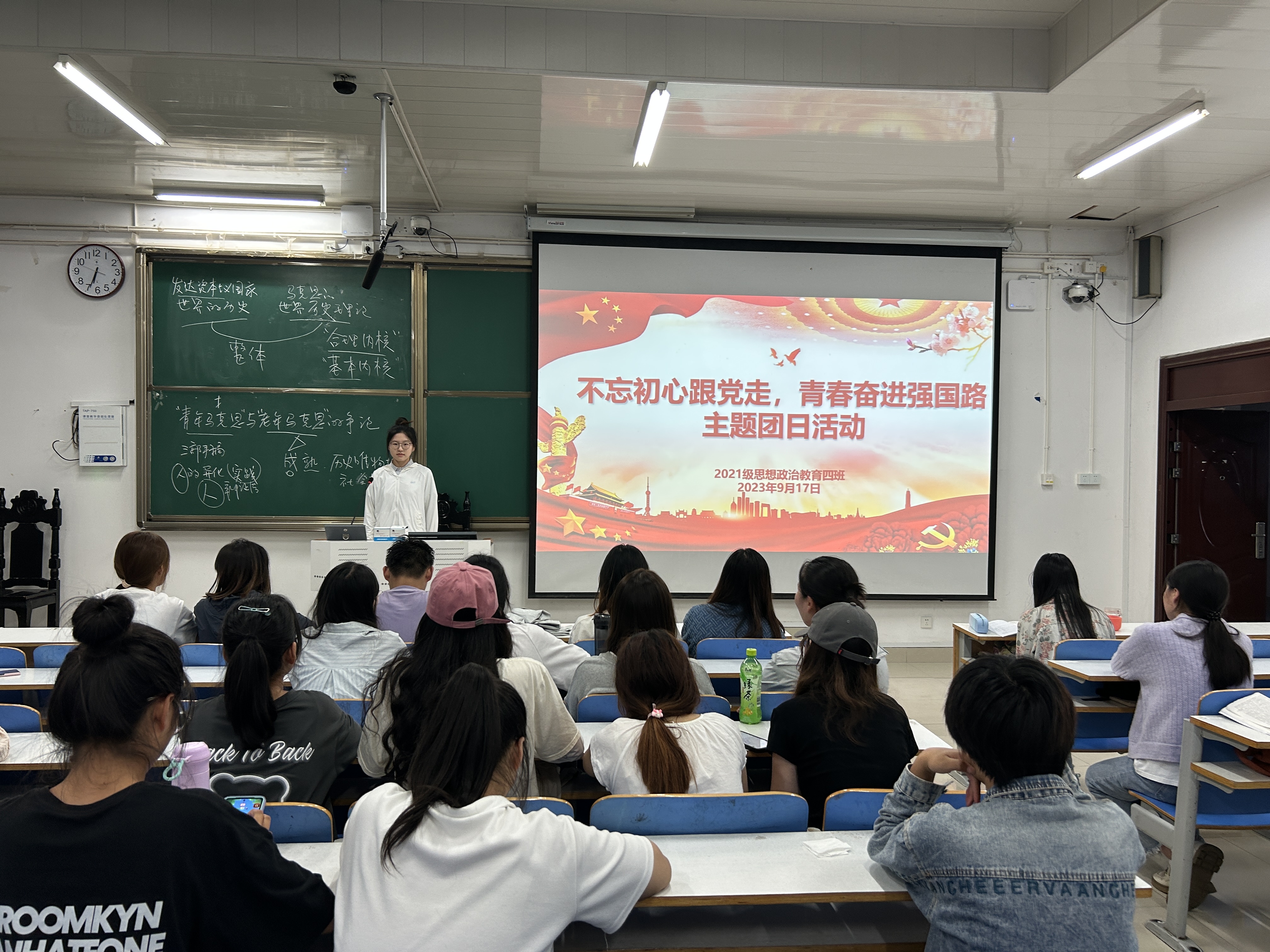 9月17日下午,太阳集团tyc59972021级思想政治教育四班在社科楼515教室召开“不忘初心跟党走,青春奋进强国路”主题团日活动。2021级思想政治教育四班全体团员共同参加本次团课。团课由团支书刘珂含主持。