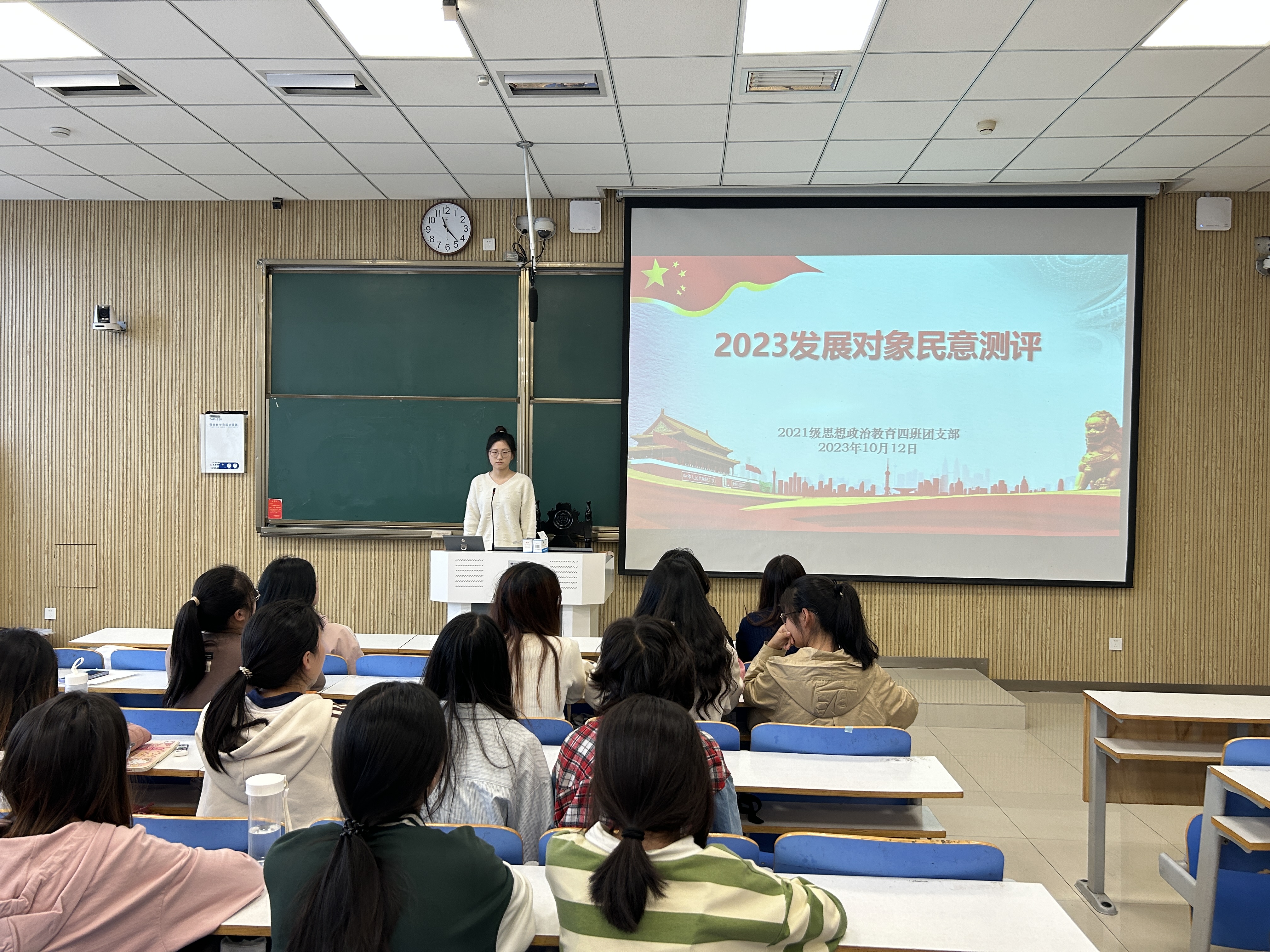 10月12日下午,太阳集团tyc59972021级思想政治教育四班在社科楼514教室召开2023年发展对象民意测评会。2021级思想政治教育四班全体团员共同参会。会议由团支书刘珂含主持。