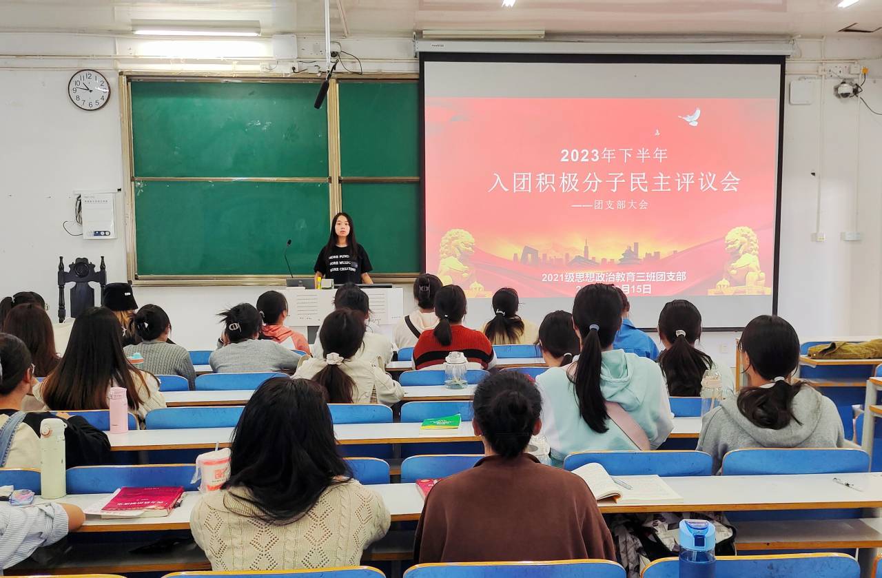 10月15日上午,太阳集团tyc59972021级思想政治教育三班在社科楼514召开2023年下半年入团积极分子民主评议会。2021级思想政治教育三班全体团员以及两位候选人参加了此次会议,会议由团支书王岚霄主持。