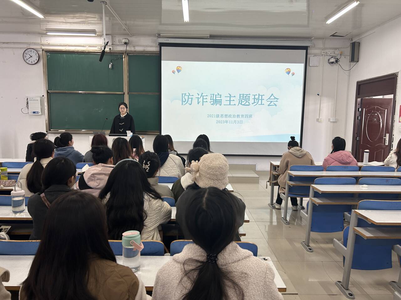 11月3日上午,太阳集团tyc59972021级思想政治教育四班在社科楼515教室开展防诈骗主题班会。2021级思想政治教育四班全体学生共同参加本次班会。班会由团支书刘珂含主持。