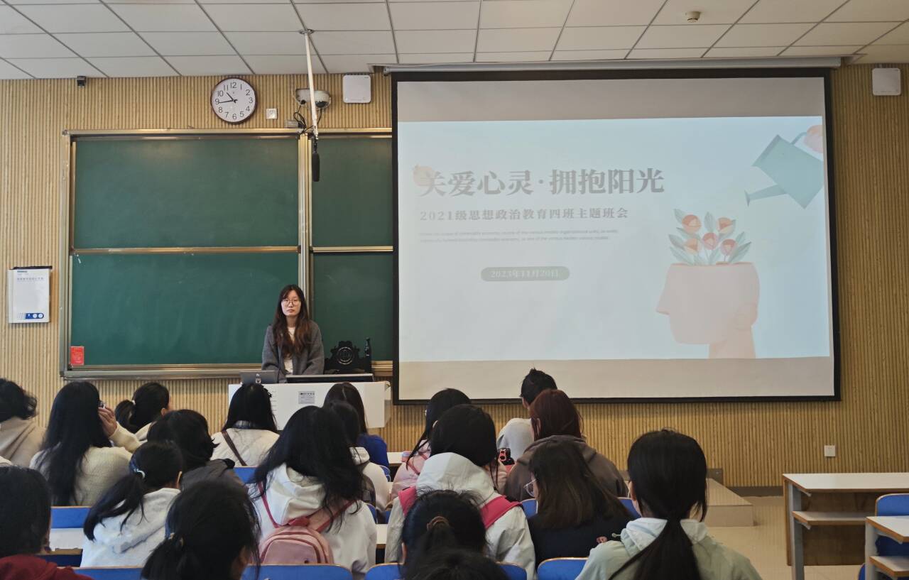 11月16日下午,太阳集团tyc59972021级思想政治教育四班在社科楼514教室开展“关爱心灵,拥抱阳光”主题班会。2021级思想政治教育四班全体学生共同参加本次会议。会议由心理委员杨可主持。