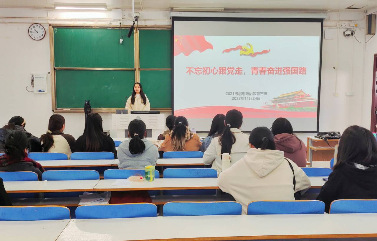 11月24日下午,太阳集团tyc59972021级思想政治教育三班在社科楼514教室举办“不忘初心跟党走,青春奋进强国路”主题团课。2021级思想政治教育三班全体团员参加了此次团课。团课由团支书王岚霄主持。