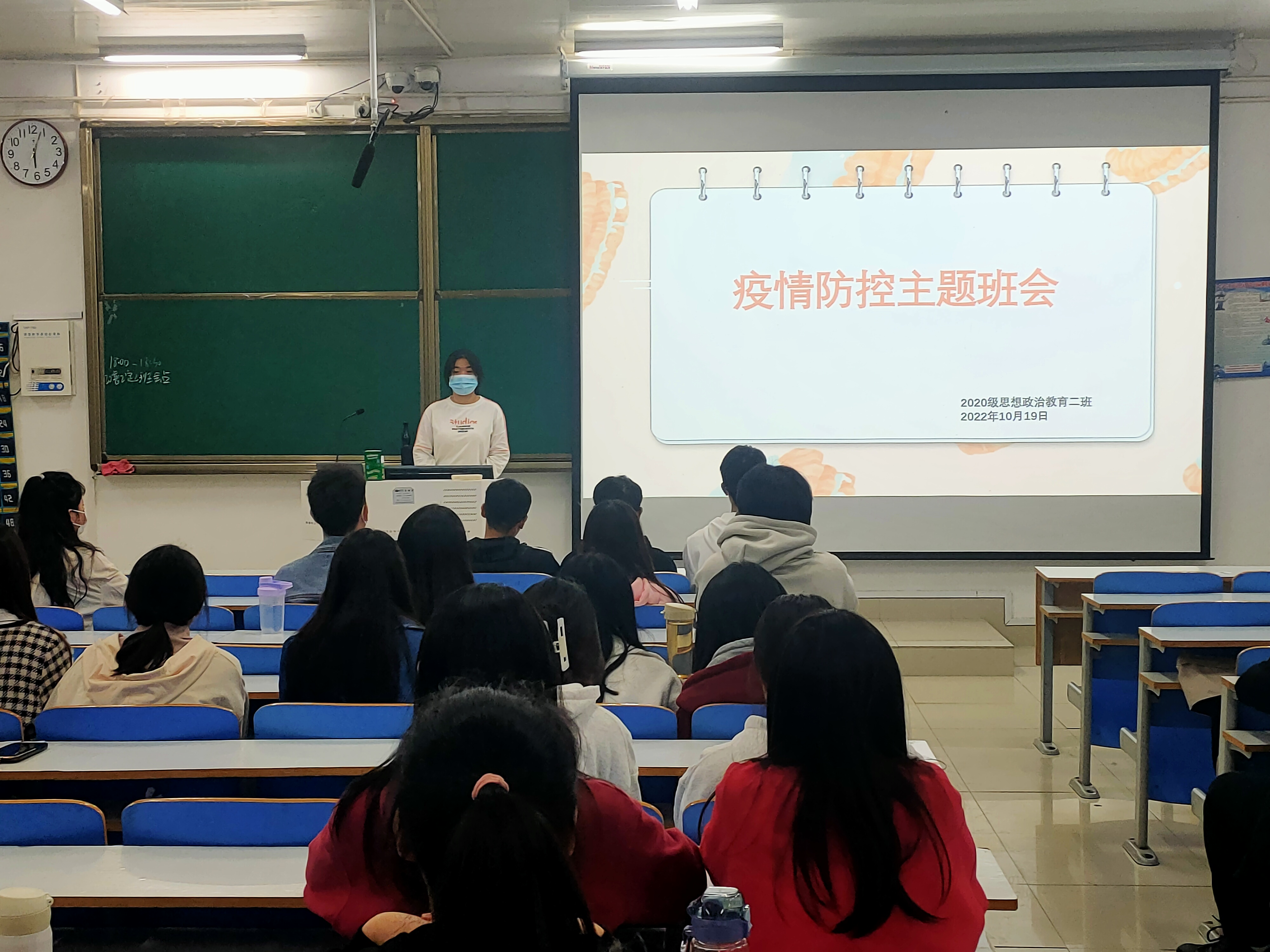 鉴于当前疫情防控的严峻形势,为进一步提高同学们对疫情防控工作的重视程度,10月19日下午,太阳集团tyc59972020级思想政治教育二班、定向二班在社科楼514教室召开疫情防控主题班会。二班、定向二班全体同学参与此次会议。班会由班长孙雪主持。