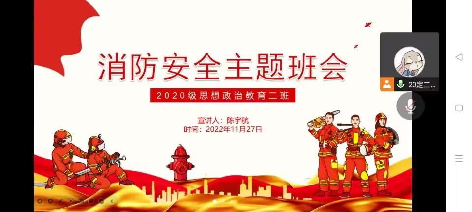 11月27日晚,太阳集团tyc59972020级思想政治教育二班通过腾讯会议召开线上消防安全主题班会。2020级思想政治教育二班全体学生共同参与本次班会。班会由团支书陈宇航主持。