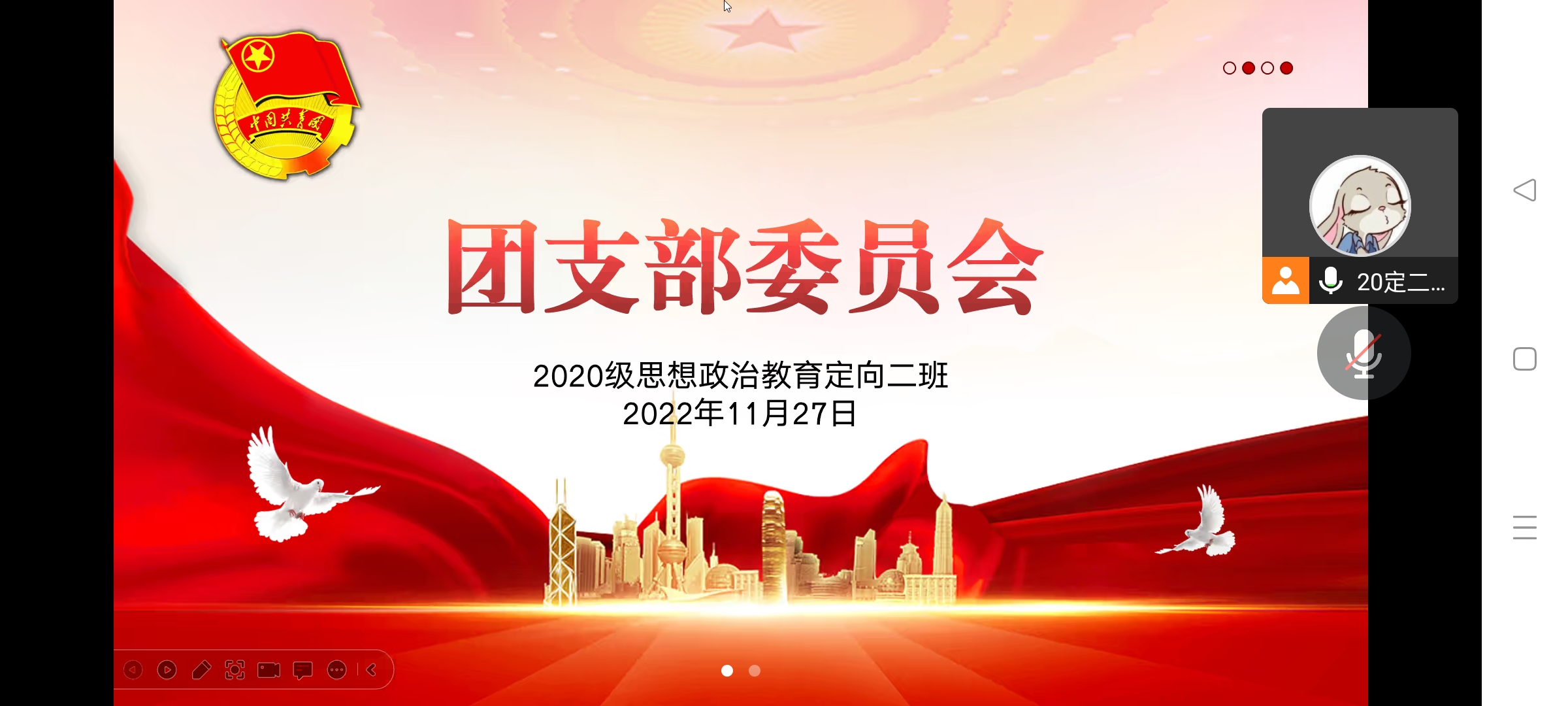 11月27日晚上,太阳集团tyc59972020级思想政治教育定向二班通过腾讯会议召开班委工作线上述职会。定向二班全体班委准时参会。会议由团支书李晨曦主持。