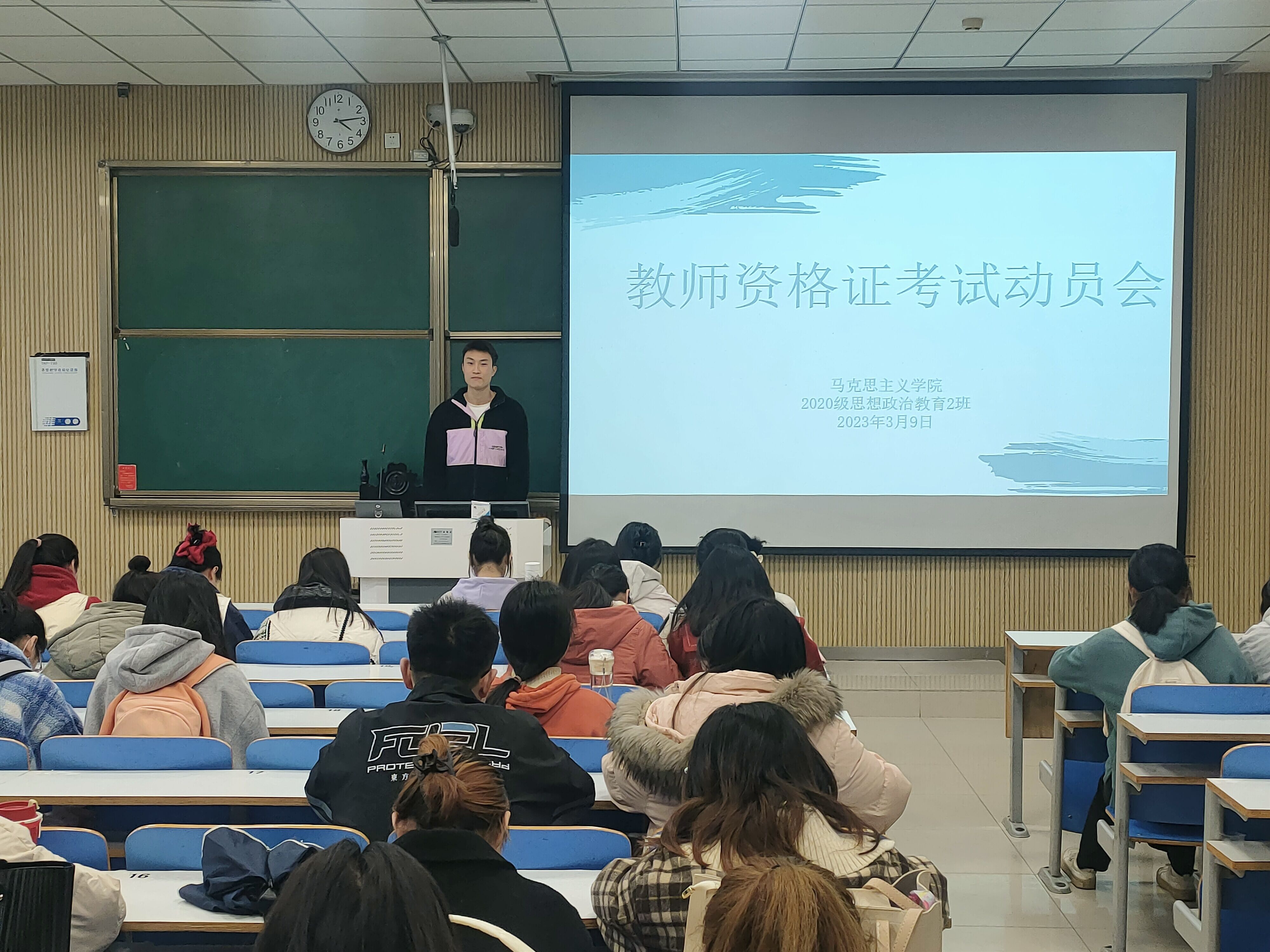 为保证我班同学在即将到来的教师资格证考试中顺利应考,3月9日下午,太阳集团tyc59972020级思想政治教育二班、定向二班在社科楼515教室开展教师资格证考试动员会。班级全体学生共同参与此次会议。会议由班长陈宇航主持。
