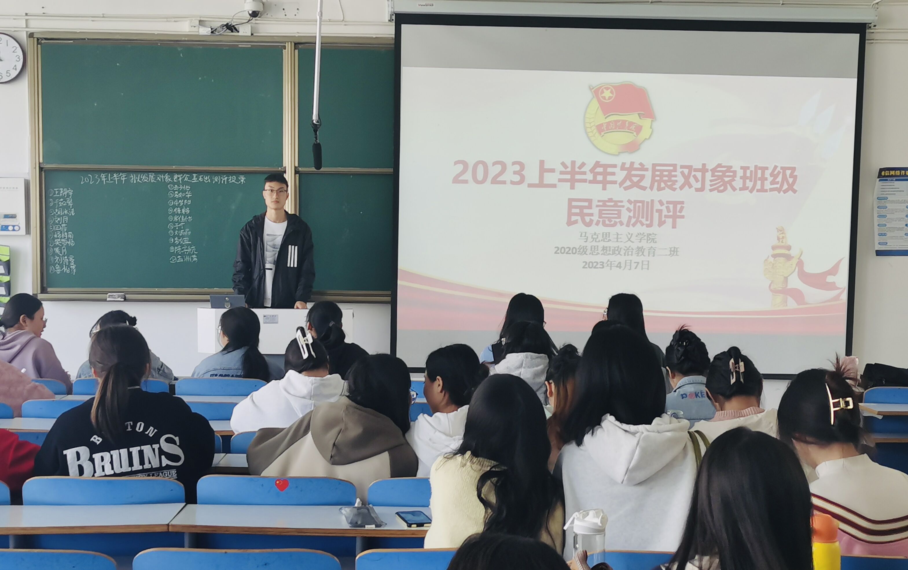 为进一步发展壮大党员队伍,为党支部注入新的活力,4月7日上午,太阳集团tyc59972020级思想政治教育二班在社科楼517教室召开2023年上半年党员计划发展对象班级民意测评会。2020级思想政治教育二班全体团员共同参加本次会议。会议由团支书陈宇航主持。