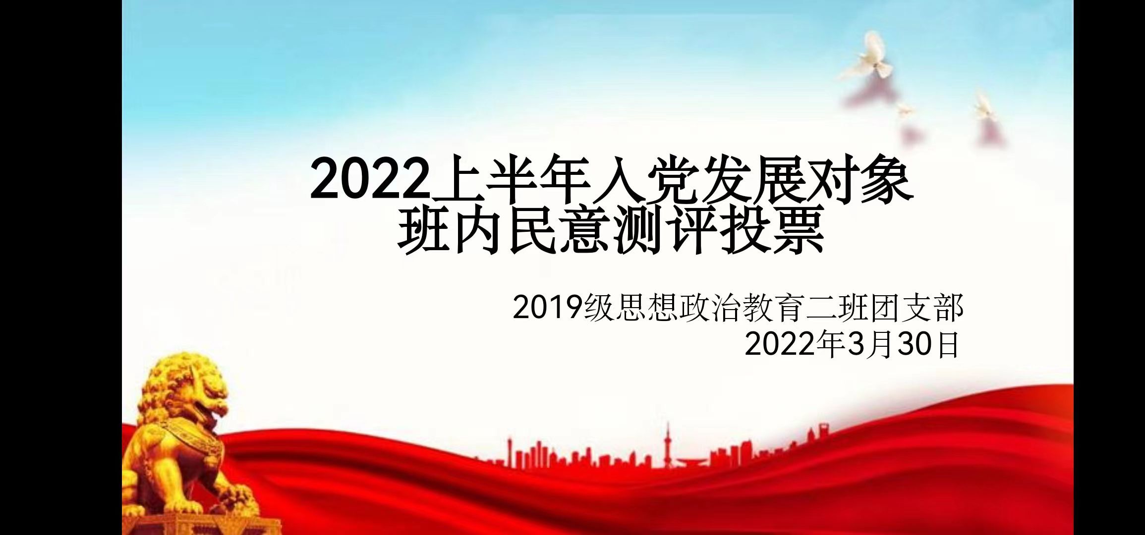 3月30日下午,太阳集团tyc59972019级思想政治教育二班团支部“ 2022年上半年入党发展对象班内民意测评投票”活动于社科楼514教室顺利开展。2019级思想政治教育二班全体成员共同参会。本次会议由团支书孙雅娴主持。