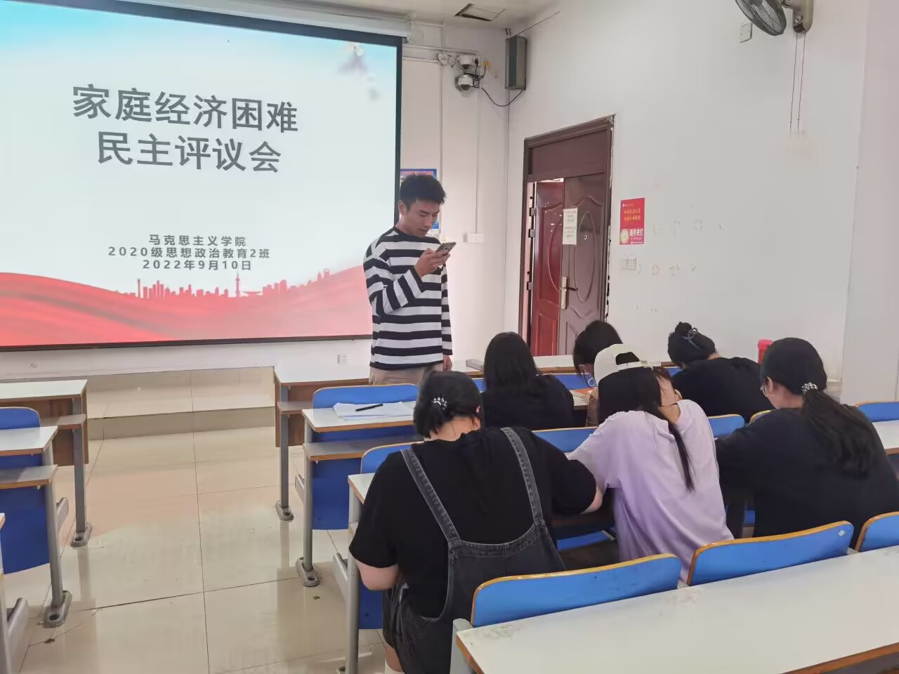9月10日下午,太阳集团tyc59972020级思想政治教育二班、定向二班在社科楼514教室召开2022年家庭经济困难学生认定民主评议会。辅导员陶青青出席会议,评议小组成员悉数到会。会议由班长高红凯主持。