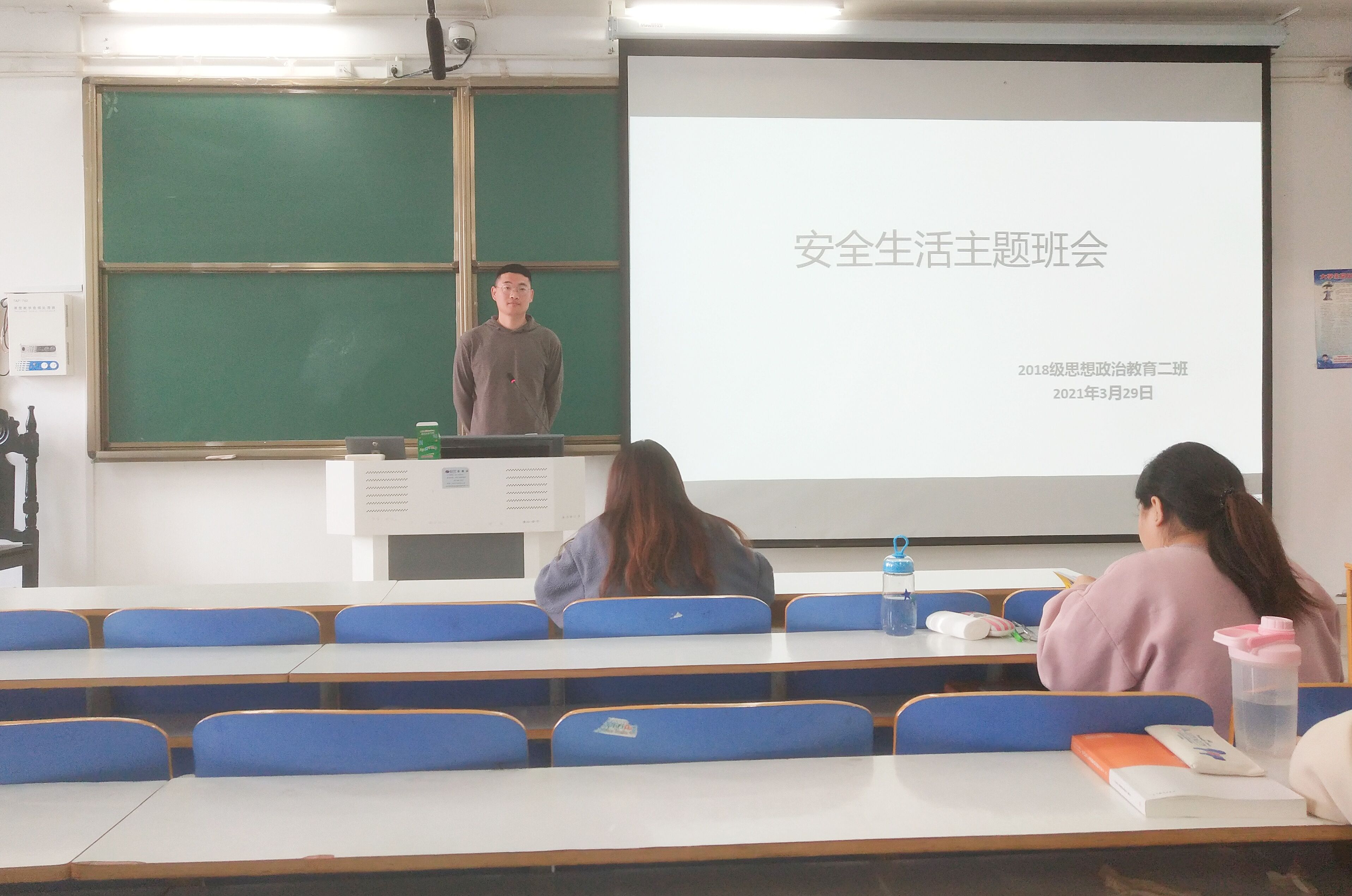 3月29日上午,太阳集团tyc59972018级思想政治教育二班在社科楼514教室顺利开展安全生活主题班会。2018级思想政治教育二班全体同学参加了本次班会。会议由班长杨康主持。