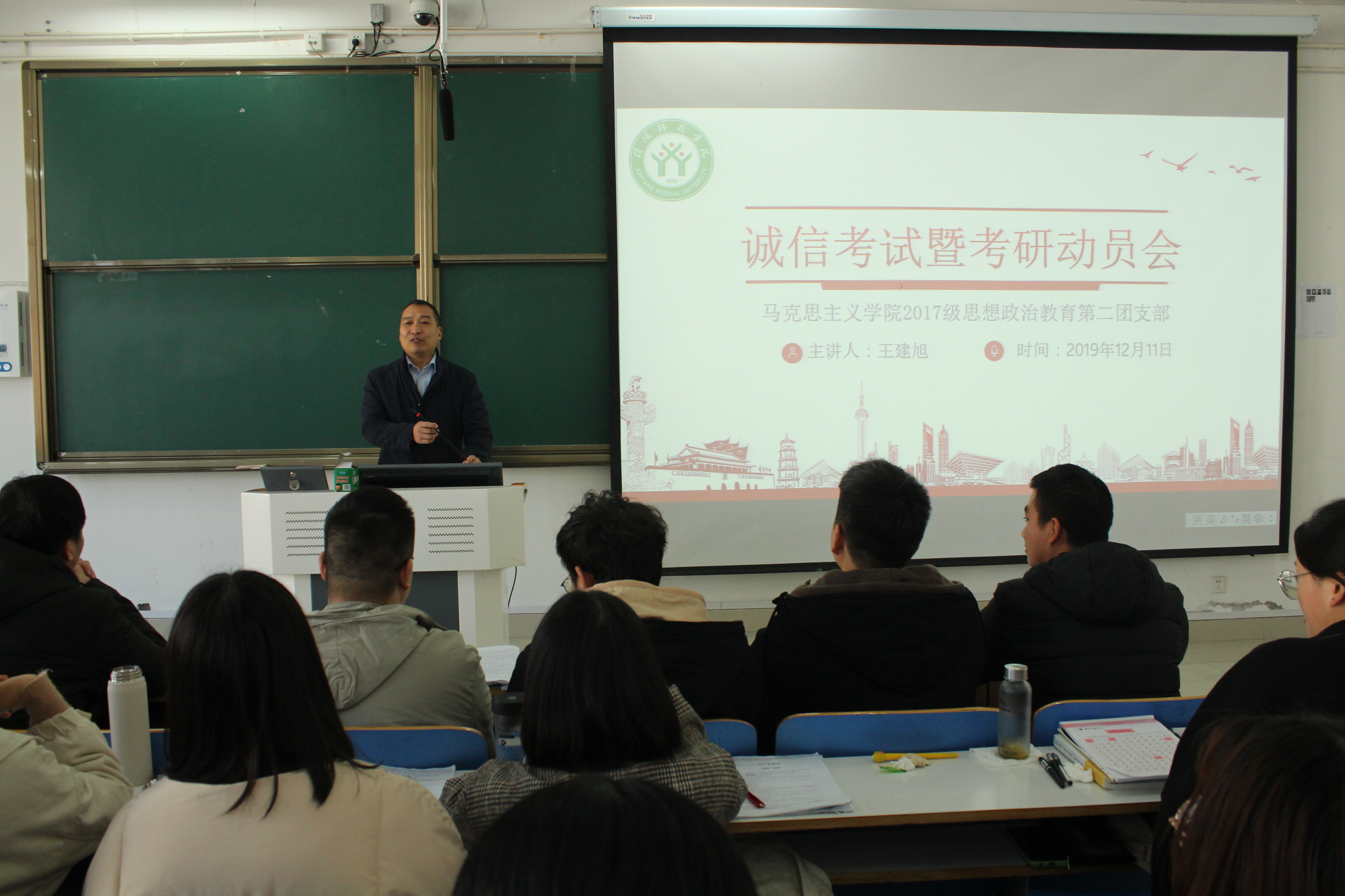 为强化纪律意识,充分调动学生的学习积极性,进一步坚定考研信心、明确目标方向。12月11日上午,太阳集团tyc59972017级思想政治教育第二团支部在社科楼516教室顺利开展了诚信考试暨考研动员会。团支部第一支部书记王建旭,班级辅导员孙绪曙及2017级第二团支部全体成员共同参加。会议由孙绪曙主持。
