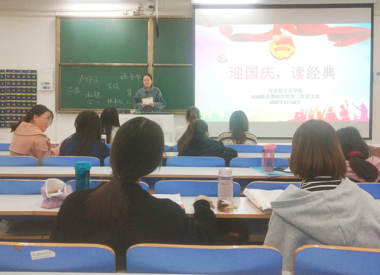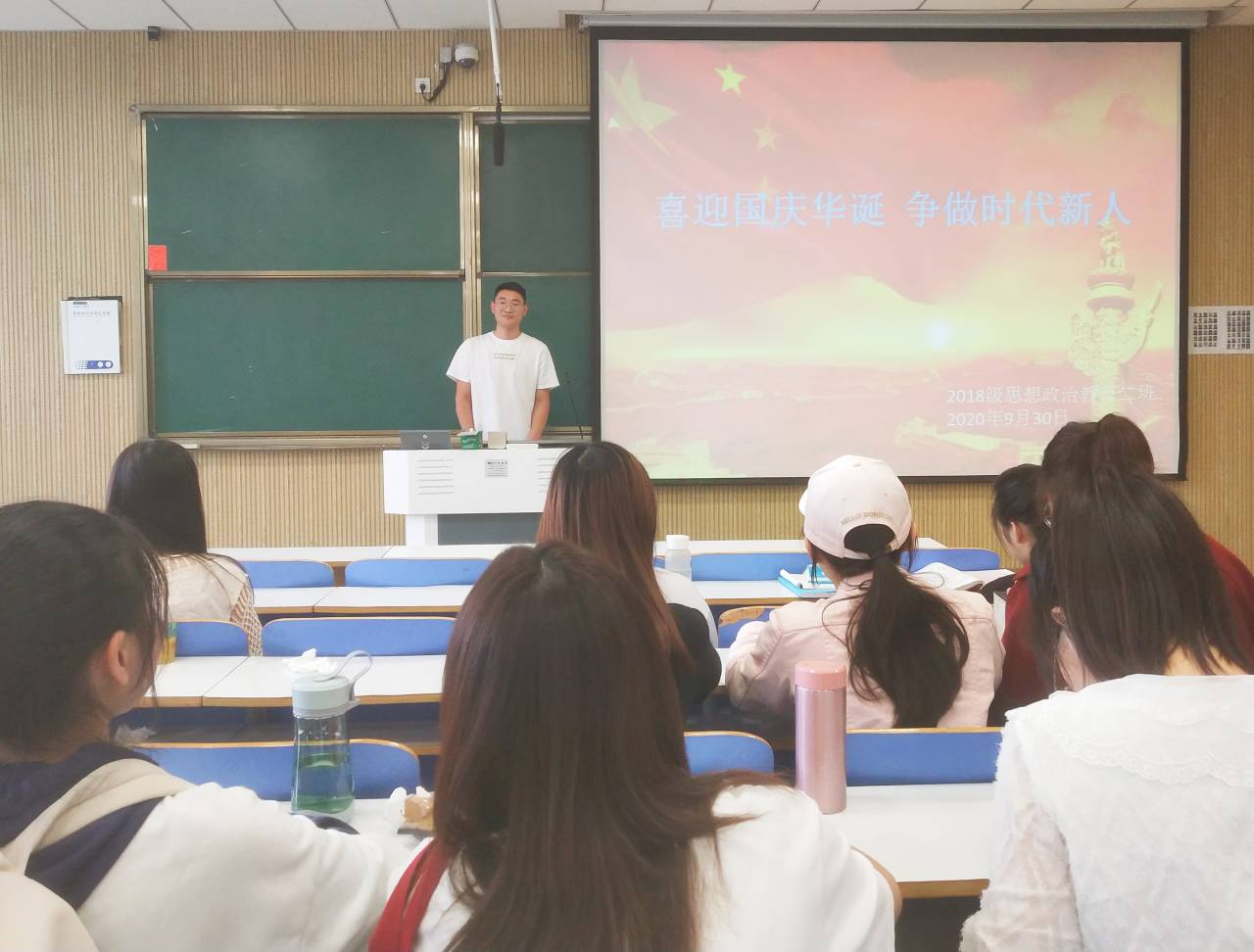 为纪念祖国七十一年华诞,激发同学们的爱国奉献精神,9月29日——10月8日,我院2018级思想政治教育二班开展了“弘扬核心价值观,展现青年担当”建国七十一周年主题团日活动。我院2018级思想政治教育二班全体成员共同参加了本次活动。活动由班长杨康、团支书黄子晋主持。